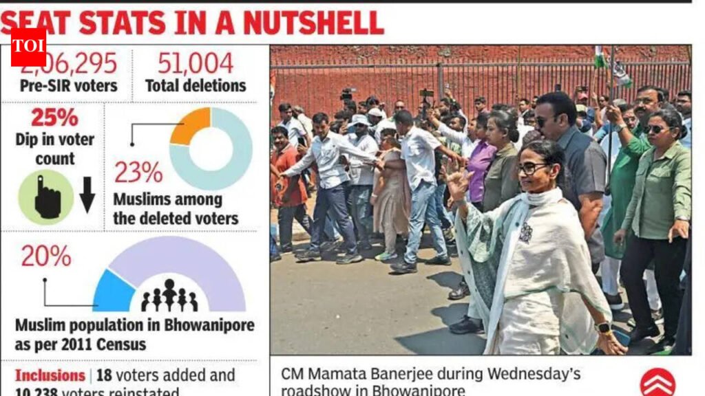 Kolkata: The electorate in the Bhowanipore assembly constituency has shrunk by nearly 25% following the Special Intensive Revision (SIR), with over 51,000 names deleted from the rolls.The high-profile seat — where chief minister Mamata Banerjee is contesting against BJP’s Suvendu Adhikari — saw a total of 51,004 deletions. Of these, 23.3% are Muslims and 76.7% are non-Muslims.Before the SIR process, Bhowanipore had 2,06,295 voters. In the first phase, 44,787 names were removed under categories such as absent, shifted, deceased, duplicate, or unmapped. A second round saw another 2,342 deletions, while 18 new voters were added. Around 14,154 voters were placed under adjudication, according to sources.Researchers from Sabar Institute — Ashin Chakraborty, Souptik Halder and Sabir Ahamed — said their analysis of 15 supplementary lists showed that 10,238 voters initially marked under adjudication were later reinstated, while 3,875 were deleted. “Among those deleted on the supplementary lists, nearly 40% are Muslims,” Chakraborty said.Election Commission sources confirmed that around 3,500 names were deleted during the judicial adjudication process. “The constituency has seen a reduction of over 50,000 voters compared to pre-SIR figures. Nearly 14,000 cases were marked under adjudication in the chief minister’s constituency,” an official said.Chakraborty noted that in the final roll, about 56.7% of those flagged ‘under adjudication’ were Muslims — significantly higher than their estimated 20% share of the population as per the 2011 Census. “Although the share of Muslims among deletions on supplementary lists has come down to around 40%, it remains disproportionately high,” he said.The institute’s analysis also showed that 43.4% of non-Muslims were placed under adjudication. While 7.7% of Muslims were ultimately deleted from the final rolls, the figure for non-Muslims stood at 92.3%.Earlier data indicated that Muslims accounted for 22.7% of voters marked as ‘Absent, Shifted, Dead/Duplicate’ (ASDD), while their share among ‘unmapped’ voters was around 26%, broadly in line with their population. However, in the ‘logical discrepancy’ category, their share rose sharply to 52%.“Given the awareness about voting rights, support from local political activists, and accessibility for fresh applications, we are also seeing significant new enrolments and reinstatements,” said Ahamed.