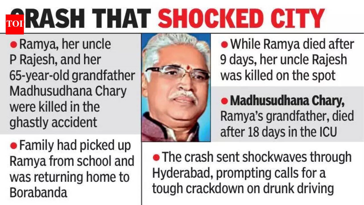 Hyderabad: Nearly a decade after a fatal road accident in Hyderabad claimed three lives across three generations, including nine-year-old Ramya, city police have initiated steps to secure the presence of one of the accused believed to be staying in the United States by seeking a red corner notice (RCN) through Interpol.Hyderabad police have begun the process against Vishnu Vineeth, one of the two accused in the case, after he allegedly failed to attend court proceedings. On July 7, 2025, TOI had reported that Vineeth was not appearing before the court, following which the judge issued a non-bailable warrant against him. In Feb this year, Banjara Hills police, through the Crime Investigation Department, sent a proposal to the CBI to pursue an RCN against Vineeth for his alleged role in the accident. While Vineeth is accused of being an accomplice, police said his friend K Shravil was allegedly driving Vineeth’s family car in a drunken condition when the crash occurred near Nagarjuna Circle.“The file is with CBI and they are in the process to send it to Interpol,” Banjara Hills police told TOI. The accident took place on July 1, 2016, when the two friends were returning in a car after consuming liquor at a pub on Banjara Hills Road No. 2. Police said the driver lost control and rammed a road divider near the Panjagutta graveyard at high speed, causing the vehicle to flip onto the other side of the road. At that moment, another car carrying the victims was travelling from the Panjagutta flyover. The vehicle allegedly collided with the accused’s car, which had suddenly fallen in front of them after the crash. In the accident, Ramya, her uncle P Rajesh, and her 65-year-old grandfather Madhusudhana Chary died. The family had picked up Ramya from school and was returning home to Borabanda when the crash occurred. Banjara Hills police initially booked the accused under sections 304-II (culpable homicide not amounting to murder) and 326 (voluntarily causing grievous hurt) of the IPC. However, in 2022, Vineeth was discharged from section 304-II charge based on a petition he filed, though he continues to face charges under section 326. While Ramya battled for her life on ventilator support for nine days before succumbing to injuries, her uncle Rajesh died on the spot. Grandfather Chary, who was in ICU for 18 days, died on July 19, 2016.