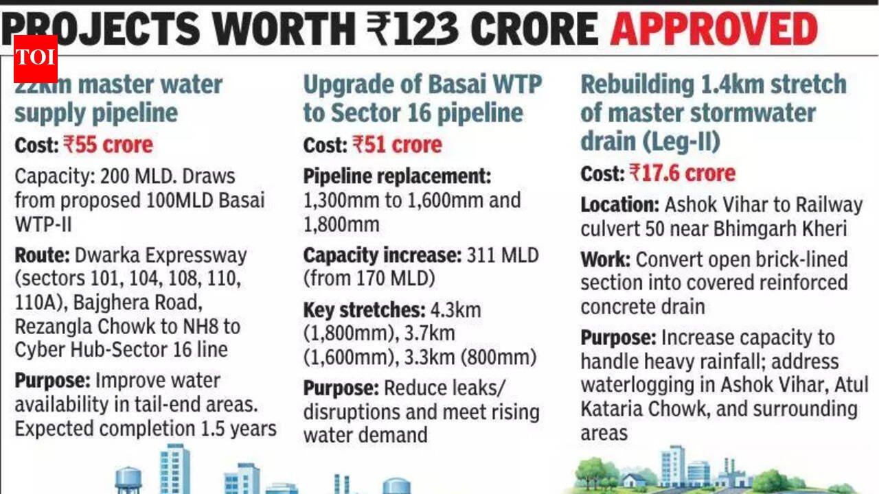Gurgaon: The state govt on Wednesday approved three infrastructure projects worth Rs 123 crore to improve the city’s water supply network and strengthen its stormwater drainage system. The projects were cleared during a meeting of the high-powered purchase committee chaired by chief minister Nayab Singh Saini.The first project, a new 22km master water supply pipeline that was conceptualised in 2023, will be laid to improve water availability in several tail-end areas that face shortages, particularly during summer.The project is estimated to cost Rs 55 crore. The pipeline will have a carrying capacity of 200 million litres per day (MLD) and will draw water from the proposed 100 MLD Basai water treatment plant-II. It will run along the Dwarka Expressway through sectors 101, 104, 108, 110 and 110A, Bajghera Road and Rezangla Chowk before crossing NH8 and connecting to the Cyber Hub-Sector 16 water supply line.Areas expected to benefit include Palam Vihar, sectors 23A, 23 and 22, HSIIDC sectors 19 and 20, Dundahera, Surya Vihar and DLF-III. Officials said the pipeline will be integrated with the existing network at four points using resilient-seated valves, allowing water diversion during repairs or maintenance. The project is expected to take around one and a half years to complete after work is allotted.The second project that the govt approved was a Rs 51 crore upgrade to the main pipeline carrying water from the Basai water treatment plant (WTP) to Sector 16 boosting station. The existing pipeline was designed to carry 170 MLD but is currently transporting nearly 200 MLD, leading to leaks and disruptions. To meet rising demand, the ageing 1,300mm pipeline will be replaced with 1,600mm and 1,800mm diameter pipelines, increasing supply capacity to 311 MLD.Under the plan, a 4.3km-long 1,800mm pipeline will be laid from Basai WTP to Umang Bharadwaj Chowk, and a 3.7km stretch of 1,600mm pipeline will be built between Hero Honda Chowk and Rajiv Chowk. In addition, an 800mm pipeline will be laid alongside the existing 1,200mm line from Rajiv Chowk to the Sector 16 boosting station, covering another 3.3km.Once completed, the pipeline network spanning about 13.35km from Basai to Sector 16 is expected to improve water supply in more than 20 sectors and colonies, including Sector 10A, Sector 37, Civil Lines and Sadar Bazar. The work will be carried out in one year, an official said.The third project involves rebuilding a 1.4km stretch of the master stormwater drain (Leg-II) between Ashok Vihar and railway culvert number 50 near Bhimgarh Kheri at a cost of Rs 17.6 crore.This section has become structurally weak over time, with parts partially collapsed, reducing its capacity to carry stormwater during heavy rainfall. Administrative approval for the project was granted in April last year, and tenders floated after that.Leg-II is an important part of the city’s drainage network. It begins in Sector 27 and flows into the Najafgarh drain, passing through areas such as sectors 29 and 41, NH 8, Atul Kataria Chowk, Sheetla Mata Road, Ashok Vihar, railway culvert number 50, Dharampur village and Sector 107.While most stretches of the drain have been covered, the portion in Ashok Vihar remains an open brick-lined channel. Under the new plan, it will be rebuilt as a covered reinforced concrete structure designed to handle higher stormwater flow.