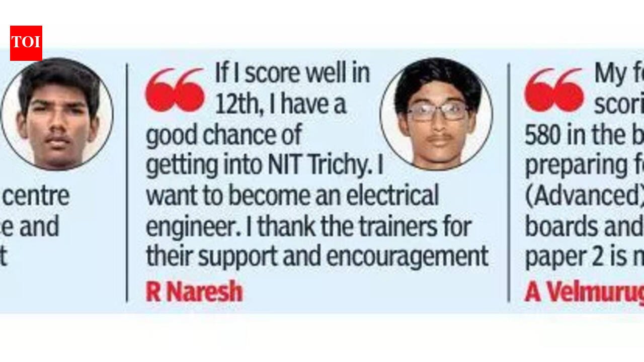 Chennai: S Praveen, a Tamil-medium student and state topper among govt school students, scored 99.5 per cent in the JEE (main) paper 1. Two other students, A Velmurugan and R Naresh, scored 99.5 and 99.42 per cent, respectively, becoming top scorers in the state. These three, who hailed from humble backgrounds, received residential coaching at the Centre of Academic Excellence (COAE), a model school in the city. While Praveen finished Class XII, scoring 588 in 2025, Naresh and Velmurugan are preparing to appear for the board exams this year. Data provided by school education department revealed that 448 students of TN govt schools scored more than 79 per cent in the first session of the JEE (main) exam. Last year, the cut-off per cent to qualify in JEE was 79 per cent.