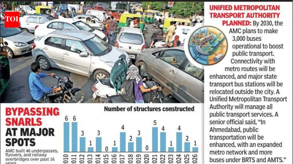 Ahmedabad: Traffic congestion continues to be a daily source of dismay and anger for Amdavadis though the AMC has logged a two-decade drive to build flyovers, railway overbridges, underpasses and culverts. Between 2010 and 2026, 46 such structures were built to unclog roads, but the jams have been immovable.Bridge building in Ahmedabad has a storied history. “When the corporation was established in 1950, Nehru Bridge on the Sabarmati was under construction, and it was opened to the public in 1952,” an AMC source said. “Ellis Bridge was built in 1892. Between 1892 and 1949, several bridges, including the Kalupur railway overbridge (1915) and Sardar Patel River Bridge (1940), were constructed.” In 1950, the Shahibaug underpass was built. From 1950 to 2000, 10 bridges and underpasses were constructed. Between 2000 and 2026, 61 bridges, underpasses, and culverts were built, with 46 of them constructed over the past 16 years. Additionally, five foot overbridges were built, and the Mithakali underpass was reconstructed in this period. “Currently, the corporation is working on more than 10 flyovers, river bridges, and railway overbridges in various parts of the city,” another AMC source said. “A new bridge parallel to Chimanbhai Patel railway overbridge is being built.” The source added, “Flyovers are under construction at Panchvati Junction and Panjrapole Junction. A barrage-cum-bridge is being constructed over the Sabarmati.” Recently, the restoration of Subhash Bridge and the construction of two-lane bridges on both sides of the river were approved. “New bridges are under construction at locations like Vadaj Junction and Naroda Patiya Junction,” the source said. Sources said that in a meeting on Jan 24, 2025, the Road and Building Committee approved a proposal to conduct a traffic movement survey at 25 junctions. The central govt’s agency CSIR-CRR conducted the survey. “The survey revealed that Memco Junction had the worst traffic jams, followed by Victoria Garden Junction in Jamalpur and Shyamal Junction in the Satellite area,” an AMC source said. “In 2025, the corporation planned to survey these junctions and construct flyovers or underpasses. Traffic surveys are also being conducted at 10 junctions on SG Highway and SP Ring Road. Over the next decade, 35 junctions are planned for flyover or underpass construction.” The sources said, “In 1981, Ahmedabad covered 98.1 sq km. The city expanded to 190.8 sq km in 1991, 464 sq km in 2011, and 480 sq km in 2021.” With this growth, the population and the number of vehicles have increased, exacerbating traffic congestion. “When a bridge is built at one junction, traffic jams increase at nearby junctions,” the source said. “Therefore, alternative solutions beyond bridges and underpasses need to be considered.”