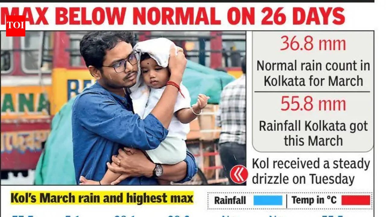 Kolkata: The month ended on a rainy note on Tuesday, making it the third-rainiest March in 15 years. With a rain count of 8 mm between Monday night and Tuesday evening taking the month’s total rain tally to 55.8 mm, Kolkata logged a monthly rain excess of 51%. While the Met office expects the city to remain dry over the next five days, officials have not ruled out frequent rain spells in April.Climatologically, Kolkata should get a monthly average rain of 36.8 mm rain in March, with mean rainy days counted as 2.1. This March has seen five rainy days, four of which were significant nor’wester spells. The Met officials said in addition to Kolkata, almost all districts recorded excess rainfall this March.“Factors like frequent passing of the western disturbance and continuous moisture incursion due to anti-cyclonic flow brought frequent thunderstorm activities in March. We expect the city to remain dry in the next five days, which may lead to hot weather conditions,” said HR Biswas, head at the Regional Meteorological Centre, Kolkata.The frequent nor’wester intervention came as a blessing for Kolkatans, who enjoyed a prolonged and steady winter. The thundershowers ensured the maximum temperature crossed the normal mark only on five days. On 26 days of the month, it stayed below normal.In fact, the city’s highest maximum temperature this month — 34.7°C, recorded on March 27 — is the second lowest for March in the past decade and a half. The Met officials attributed this to the frequent thunderstorms.In 2021, Kolkata did not get rain for a single day and the maximum temperature inched close to 40°C on the last day of the month. However, this year, the maximum temperature dipped below 30°C on two occasions — 27.2°C on March 22, following 19.8 mm rain the previous day, and on Tuesday when Alipore recorded a maximum temperature of 28.7°C, six notches below normal.While the minimum temperature at 23°C on Tuesday was 1.6 notches below normal, it hovered above the normal mark on 20 days of the month. The Met officials said this was due to frequent moisture incursion. It shot up as high as 26.3°C on Monday.“The broader outlook for April is somewhat similar to what we encountered in March in terms of frequent nor’wester spells and the maximum temperature on most days likely to hover around or below the normal. While it could go up temporarily for a day or two, we expect thunderstorm activities to neutralise the rising heat at frequent intervals,” added Biswas.Since election campaigning is picking up pace, the Met officials also cautioned political parties to stay tuned to IMD’s nowcast alerts issued about an hour before a thunderstorm as these nor’wester spells strike mainly towards the evenings when many come out for campaigning.