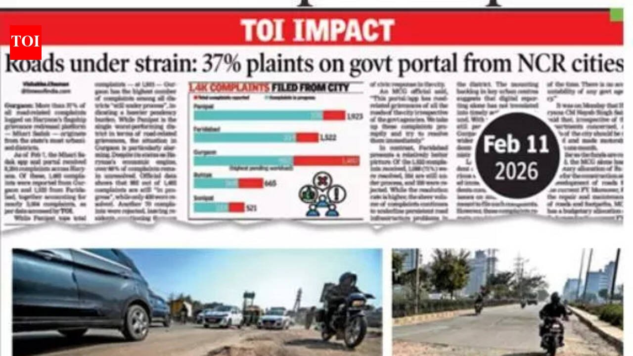 Gurgaon: MCG on Wednesday announced a 10-day drive to make city roads pothole-free. The civic body set a target to fill at least 5,000 potholes in the first phase.This was decided in a detailed review of road-related complaints received on Haryana’s road-grievance platform — Mhari Sadak. This comes days after TOI reported that 37% of all complaints on Mhari Sadak originated from the NCR cities of Gurgaon and Faridabad. At the meeting, additional commissioner Ankita Chaudhary gave clear instructions to the officials and engineers that complaints registered on the portal should be resolved with priority, promptness and quality. “Complaints are an important basis for the administration’s accountability. Therefore, time-bound and effective disposal of each complaint is mandatory,” the additional commissioner said.Under the pothole-free campaign, the goal was set to improve road safety and provide better transportation facilities to the public. The additional commissioner said that, for the target to fill hundreds of potholes in the first phase of the campaign, concerned departments were directed to mobilise necessary resources and complete the work in a time-bound manner. She told the engineers that special attention should be paid to the quality of work so that repairs remain durable for a long time and citizens do not have to face problems repeatedly.TOI reported on Feb 11 that as of Feb 7, the Mhari Sadak app and portal received 8,204 complaints across Haryana. Of these, 1,482 were from Gurgaon and 1,522 from Faridabad — together nearly 3,004 complaints, an outsized share from just two cities. Even more troubling was the resolution rate. Data showed that more than 66% of Gurgaon’s complaints remain unresolved: 982 out of 1,482 were still marked “in progress”, while only 430 were addressed.At the review meeting on Wednesday, Chaudhary said that not only the Mhari Sadak portal, but all road-related complaints received on the complaint handling system (CHS) portal should also be resolved swiftly. She directed engineers to review all pending cases and dispose of them quickly on a priority basis. She said that providing better road facilities to citizens is the corporation’s primary responsibility and no negligence in this regard will be tolerated.The corporation also appealed to residents that if they have information about potholes or other problems on roads, they should register complaints on the relevant portal so that timely action can be ensured. This step by MCG is significant in the direction of ensuring a better road system, safe traffic and smooth movement in the city, said MCG officials.On Tuesday, MCG also constituted a road development cell (RDC) to closely monitor infrastructure projects and ensure faster grievance redressal. For quicker redressal of complaints, the cell will track grievances received through various platforms, including the GMDA portal, the MCG mobile app and the Mhari Sadak platform.