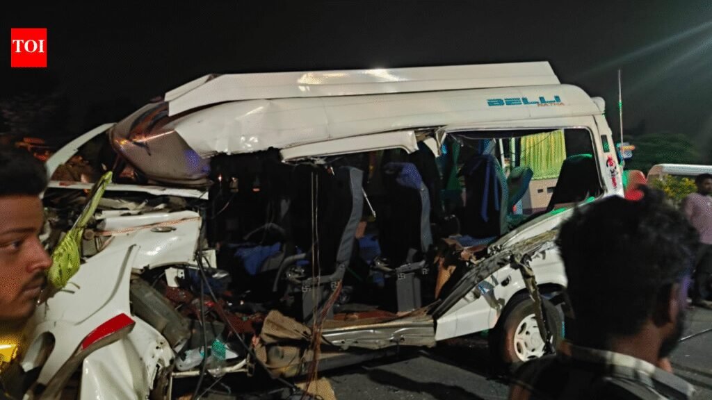 BENGALURU: Six persons, including three women on pilgrimage and three men travelling in a mini goods vehicle, were killed in two separate road accidents in Devanahalli and Medahalli since Saturday night. What began as a spiritual journey to Kashi ended in heartbreak, as three women lost their lives after a speeding truck hit their Tempo Traveller (TT). Based on the preliminary investigation, police said a group of 12 people from Tiptur in Tumakuru district had set out on a 15-day pilgrimage, heading to Kempegowda International Airport (KIA) to catch an early morning flight to Kashi. Travelling in a TT vehicle, they left Tiptur around 10 pm. After reaching Devanahalli, the driver relied on Google Maps to navigate the route. However, near Rani Cross in Devanahalli, tragedy struck. The TT vehicle reportedly missed the correct service road turn and moved ahead. While attempting a U-turn at the next junction, a speeding truck collided with the TT. The impact was devastating—crushing the front left side of the TT vehicle and killing three women on the spot. The deceased have been identified as Jayamma (60), Yashodamma (60), and Ganga (38). Another woman, identified as Kempamma, sustained serious injuries and was shifted to a nearby hospital. In total, eight persons, including the driver, were injured and were initially treated at a private hospital in Devanahalli. The force of the crash left parts of the TT vehicle mangled. The truck driver fled the scene soon after the accident. Devanahalli traffic police rushed to the spot, conducted an inspection, and shifted the bodies to the mortuary. In a separate incident near Medahalli on Saturday midnight, three men travelling in a Tata Ace mini goods vehicle died after crashing into a truck parked on the roadside due to a flat tyre. The driver and two occupants identified as Manikanta, Suresh and Srinivas died on the spot. The mini goods vehicle was transporting potatoes from Kolar to Bengaluru. The deceased persons are residents of the Whitefield area. Due to the impact of the accident, the front part of the mini goods vehicle was mangled.