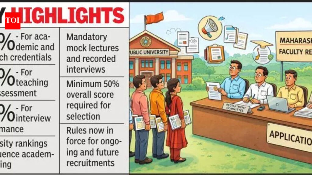 Nagpur: Maharashtra state govt’s revised faculty recruitment rules for state public universities have formally come into effect, introducing a clearly defined weightage-based selection system aimed at making the appointments more transparent, objective and merit-oriented than earlier. The new framework, notified by the higher and technical education department on Wednesday, applies to the recruitment of assistant professors, associate professors and professors across all state public universities.Under the revised norms, the selection process will be conducted on a total of 100 marks, with 60% weightage assigned to academic and research credentials, while the remaining 40% weightage will be shared equally between teaching skill assessment and interview performance. Academic and research evaluation will include qualifications, teaching and postdoctoral experience, research publications, books, patents and other intellectual property, awards, Massive Open Online Courses (MOOCs), free or low-cost online courses designed for unlimited participation and open access via the web, featuring university-level materials, PhD guidance and externally funded research projects.A significant feature of the new system is academic scores will be linked to the ranking of the degree-awarding institution, including National Institutional Ranking Framework (NIRF) rankings for Indian universities and QS, THE and ARWU rankings for foreign universities, with proportionate weightage applied accordingly. Teaching skills will be assessed through mandatory mock lectures conducted before selection committee, while interview performance will be evaluated on parameters such as subject knowledge, critical thinking, future academic plans, outreach and understanding of National Education Policy.The final merit list will be prepared by combining scores under all 3 components, and only candidates securing a minimum of 50% overall marks will be considered eligible for selection. To further strengthen transparency and reduce subjectivity, the rules mandate audio-video recording of entire selection committee proceedings, which will be sealed and preserved confidentially and produced only if required.Govt clarified that ongoing recruitment may be completed under revised weightage system, and that all future appointments in state universities will compulsorily follow these rules, which now came into force following issuance of this GR.