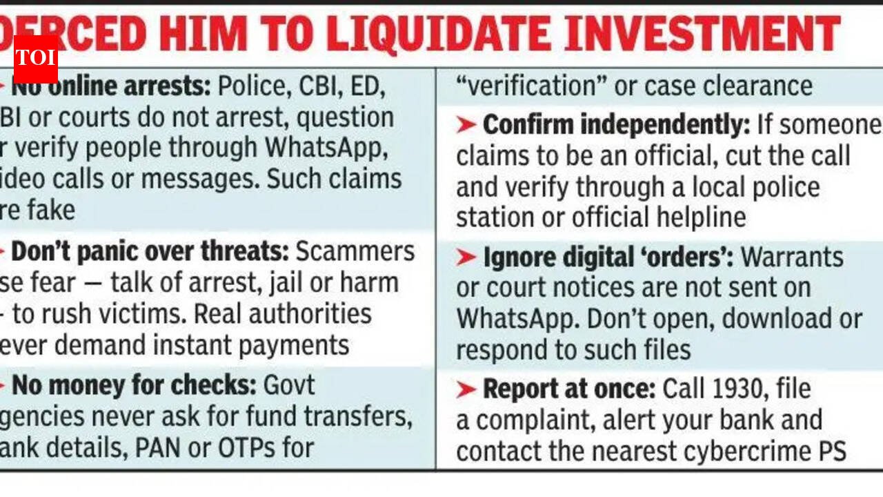 Kolkata: A 61-year-old Sinthee resident has alleged that he was duped of over Rs 61.8 lakh in a digital arrest scam in which fraudsters, posing as cops from Mumbai, coerced him into liquidating his assets and transferring the money under the pretext of a terror funding probe. The man lodged a complaint stating that he received a phone call on April 1 from a person claiming to be from Colaba Police Station.. The caller allegedly told him that his Aadhaar number had been used to open a bank account at a nationalised bank that was linked to terror funding activities.According to the complaint, the caller shared a purported statement of the account via WhatsApp, along with several documents bearing what appeared to be govt insignia, to lend credibility to the claim.“The man alleged that he was then subjected to sustained pressure and intimidation, with the fraudsters warning of imminent arrest unless he cooperated with the fake investigation,” said a senior officer of Kolkata police.The accused allegedly instructed him to sell the shares that he held and transfer the funds to accounts they claimed were linked to the RBI. He complied and transferred Rs 61,80,200.The fraudsters maintained contact through multiple phone and video calls, using at least two mobile numbers. Only after four days did he realise he had been deceived.