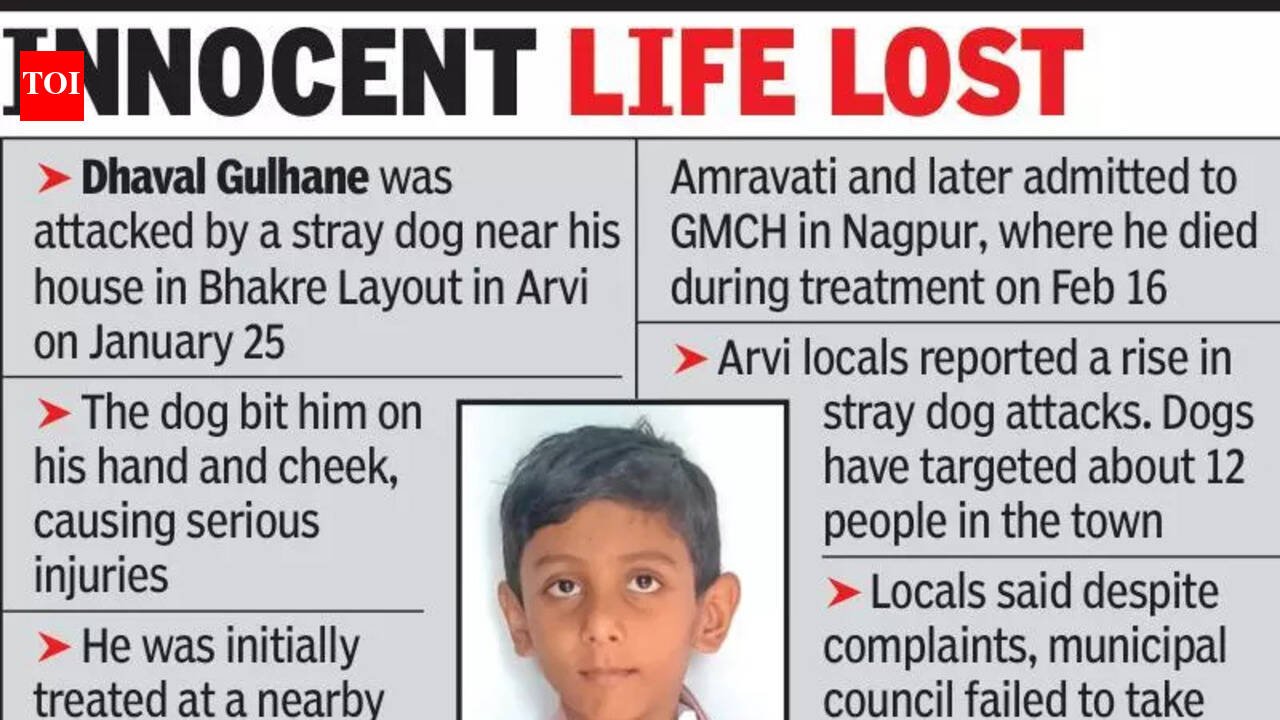 GMCH medical superintendent Dr Avinash Gawande said the child was brought on Feb 16 with a history of a dog bite. He had received some doses of the anti-rabies vaccine earlier as per records, but the vaccination regimen was not completed. “The bite had occurred on Jan 25, and there was a delay in seeking comprehensive treatment. For the last two days, the child had developed hydrophobia symptoms, which are indicative of advanced rabies. Incomplete vaccination and late presentation significantly increased the risk and contributed to the unfortunate outcome.” The incident has cast a shadow of mourning over the city and sparked fear among parents. Locals reported a rise in stray dog attacks and about 12 people falling victims recently. Locals have alleged that despite repeated complaints, the municipal council failed to take concrete measures to control the stray dog menace.Arvi municipal council chief officer Kiran Sukulwar said, “As soon as we received information about the incident, the concerned rabid dog was caught.”Following the tragedy, residents have demanded that the municipal council immediately launch a dog-catching drive along with vaccination and sterilisation campaigns. Arvi MLA Sumit Wankhede said, “The incident is unfortunate. The entire city stands with Dhaval’s family in their grief.” Wankhede stressed the need for rabies prevention measures and sterilisation drives to prevent such incidents in the future. He said the municipal council has initiated a campaign in this regard. “Citizens and animal welfare organisations should cooperate with the administration,” he added.