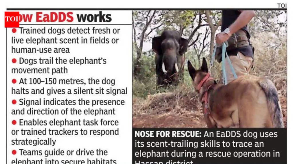 Hassan: Forest department has introduced the Elephant Anti-Depredation Dog Squad (EaDDS) in Hassan to improve early warning and tracking of wild elephants. The system was used successfully for the first time on April 18 to rescue an elephant, said Hassan deputy conservator of forests Saurabh Kumar.Developed by conservation organisation A Rocha India, EaDDS aims to reduce human-elephant conflict by using trained Belgian Malinois dogs, officials said.According to A Rocha India, EaDDS is a science-based, collaborative conservation initiative that integrates trained canine units with govt-led field operations to enable safer coexistence between people and elephants in Karnataka. The initiative was developed in Bannerghatta to address rising human-elephant conflict.The dogs work alongside forest personnel during patrols and conflict-response operations. The project is currently deployed on a pilot basis in the Hassan Forest Division under the guidance of additional principal chief conservator of forests (Project Elephant), with the long-term goal of integration into forest department operations.The current focus is on improving detection time to strengthen response and intervention in human-elephant conflict situations.