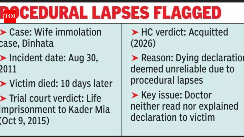 Kolkata: Nearly a decade after a Dinhata man was convicted of immolating his wife, Calcutta HC on Monday acquitted him, discrediting the victim’s dying declaration over procedural lapses such as not reading it over or explaining it to her.The division bench of Justice Rajasekhar Mantha and Justice Rai Chattopadhyay said a dying declaration can sustain conviction if voluntary and beyond doubt. In this case, however, the bench found suspicious circumstances around the declaration — the sole basis for convicting husband Kader Mia.They questioned why the Dinhata SD Hospital doctor who recorded the dying declaration in on Sept 1, 2011, did not inform police. The bench also noted the doctor could not explain why the victim gave a thumb impression instead of signing, and why the statement was not taken in the presence of family members.The “dying declaration” was crucial as key witnesses, including the victim’s father and brother, had turned hostile, the post-mortem could not confirm homicide, and the probe was flawed. A dying declaration can be recorded by any respectable state officer. A govt hospital doctor qualifies, but this doctor does not appear responsible, having admitted during trial that he neither read over nor explained its contents to the victim, the court held. Kader Mia was sentenced to life by a Dinhata court in 2015. The case began on Sept 1, 2011, when the victim’s father alleged her husband and in-laws set her on fire. She died 10 days later. Her family later retracted allegations, claiming the couple had cordial relations and denying kerosene attack or suicide.