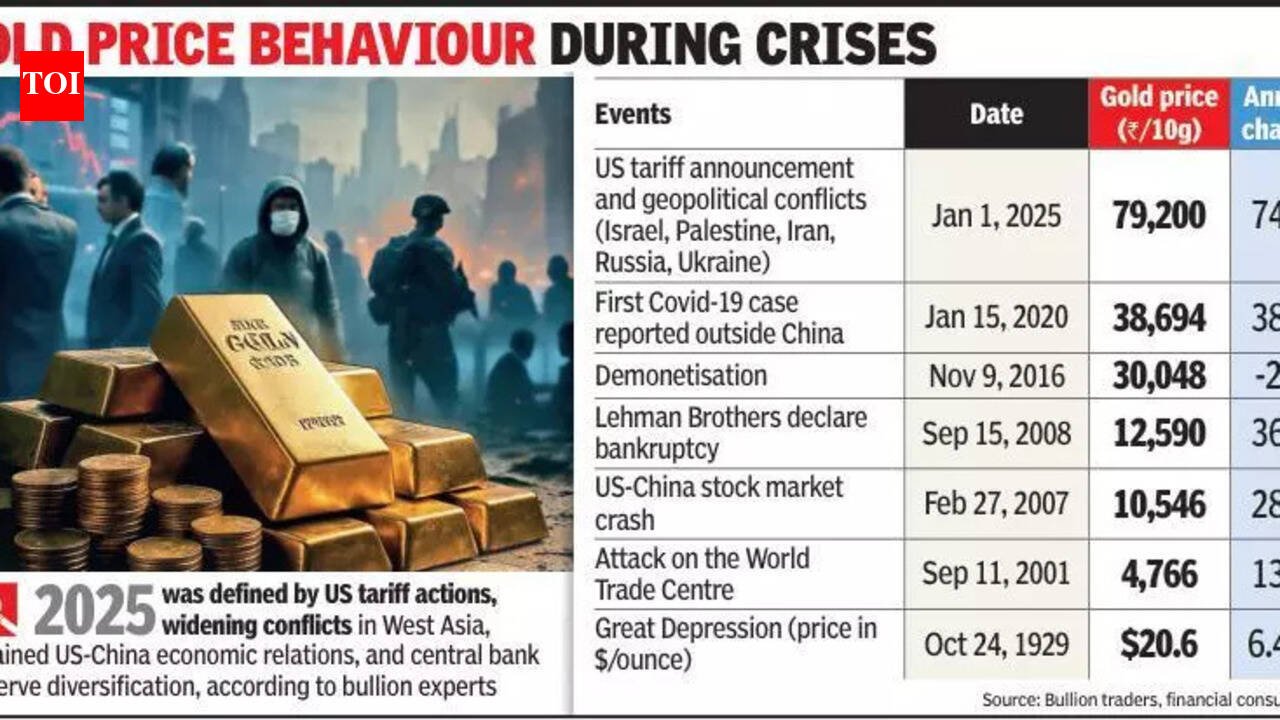 Ahmedabad: Gold has always glittered brightest in times of global turmoil. But bullion traders say the steepest rally in recent decades has unfolded in 2025, triggered by escalating tariff wars, geopolitical flashpoints and a structural shift in global reserve strategies. Domestic prices climbed as much as 75% in this period, contributing to a 74% annual rise.Traditionally viewed as a hedge against economic and political uncertainty, gold has surged during crises ranging from the 2008 financial collapse and the 9/11 terror attacks to the Covid-19 pandemic and even the Great Depression of 1929. However, market participants point out that the 2025 upsurge has been sharper and broader than previous cycles.The rally gathered momentum after the United States announced fresh tariffs in April 2025, initially at 26% and later raised to 50% in July. Following these measures, domestic gold prices rose between 58% and 75% until Friday, Feb 6. Prices climbed from around Rs 91,500 per 10g in early April to approximately Rs 1,01,400 by end-July. Overall, gold prices in 2025 rose by 74%, supported by tariff shocks, geopolitical tensions and central bank buying. In comparison, gold had risen 38% after the first Covid-19 case was reported outside China in Jan 2020. During the 2008 Lehman Brothers collapse, gains stood at 36%. Analysts attribute the current rally to heightened volatility across global financial markets and a growing shift away from dollar-centric assets.Haresh Acharya, director, India Bullion and Jewellers’ Association (IBJA), said the rally reflects more than traditional safe-haven demand. “We are seeing an unusual combination of factors shaping investor behaviour. Along with geopolitical tensions and tariff-driven shocks, there is a broader re-evaluation of confidence in the US dollar as the undisputed global reserve currency. Both central banks and private investors are diversifying reserves into precious metals. While the dollar remains dominant, this recalibration of trust is a key driver behind gold’s strength today,” he said.According to the World Gold Council, gold saw a historic, record-breaking rise, with prices scaling 53 new all-time highs globally and rising over 70% in some markets. “This was driven by intense geopolitical tensions during the year, tariff wars, central bank buying, and safe-haven investments. Unlike past crises, the 2025 rally was driven by a mix of massive ETF inflows, high-volume bar/coin demand, and structural shifts in central bank holdings,” according to the WGC Gold Demand Trends Report.The assets under management (AUM) for Gold ETFs in Gujarat rose 162% from Rs 681.53 crore to Rs 1,792.37 crore. During the same period, pan-India growth in AUM for gold ETFs was 173%, which closed at Rs 1.2 lakh crore in Dec 2025.Jayesh Vithalani, a financial adviser, said, “Globally, the US dollar has weakened against most major currencies, even though it gained against the Indian rupee. That divergence had a ripple effect on investor behaviour. We are seeing a clear shift away from equities into physical gold and gold ETFs, driven by expectations of further price appreciation. Both gold and silver posted a strong rally, which reinforced sentiment around precious metals as safe-haven assets, especially with central banks continuing to accumulate gold. Investment demand remains bullish, though jewellery buying stayed muted as consumers hold back at current price levels.”