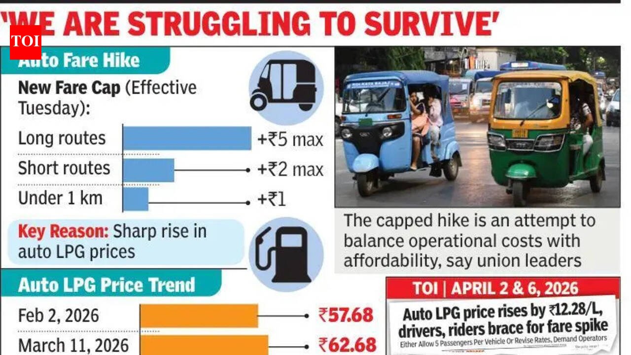 Kolkata: After weeks of fare disputes, commuter complaints and internal disagreements, auto-rickshaw unions in Kolkata have finally agreed to implement a uniform fare hike across routes, bringing temporary relief from the chaos that gripped the city’s last-mile connectivity.The revised fares, approved by the ATTUC-affiliated Auto Operators Welfare Association, will come into effect from Tuesday. Under the new structure, fares on long routes will see a maximum increase of Rs 5, while shorter routes will be capped at Rs 2, and trips under one kilometre will rise by Re 1.The decision follows sustained pressure from auto operators after three successive hikes in auto LPG prices, which surged to Rs 82.96 per litre in less than 30 days in March and April. Operators had been demanding either a fare revision or permission to carry five passengers per trip — something authorities were reluctant to allow due to safety concerns.For many drivers, the fare hike comes as a necessary correction rather than a gain. “Fuel prices have gone up so sharply in just a month. Earlier we managed somehow, but now it’s impossible,” said Abdul Rahman, an auto driver operating on the Tollygunge-Behala route. “We were struggling to survive. This hike is small, but at least it acknowledges our situation.”Auto LPG prices have risen steeply since Feb— jumping from Rs 57.68 on Feb 2 to Rs 82.96 by April 1 — placing significant financial strain on operators. Union representatives said that the delay in implementing a uniform revision was due to internal disagreements and concerns over public backlash run up to the poll.“We did not want arbitrary fare hikes. Some routes increased fares on their own, which created confusion,” said a representative of the Auto Operators Welfare Association. “After discussions, we have ensured a uniform and regulated structure across the city,” he added.In the absence of a coordinated decision, several routes briefly raised fares independently, triggering protests from commuters and intervention from unions. Many of these hikes were later rolled back. For daily passengers, the past few weeks have been marked by uncertainty.“Every day the fare was different. Sometimes Rs 5 more, sometimes back to normal. We didn’t know what to expect,” said Priyanka Das, a student, who commutes between Gariahat and Behala. “At least now there is clarity, even if we have to pay more,” she added. Office-goers, too, expressed mixed reactions. “I understand drivers are facing issues, but for us also expenses are rising. Transport is a daily necessity and small increases add up over time,” said IT employee Souvik Chatterjee, who travels from Ultadanga to Sector V. Union leaders say the capped increase is an attempt to balance rising operational costs with commuter affordability. “There was pressure from drivers, some even threatening to leave unions. At the same time, we had to consider public sentiment,” said another union member. However, concerns remain over enforcement and future revisions if fuel prices continue to rise. For now, both commuters and operators appear willing to accept the compromise, hoping it brings stability after weeks of disruption. “Will the fare be rolled back once the fuel price goes down?” asked Sourav De, a filmmaker.