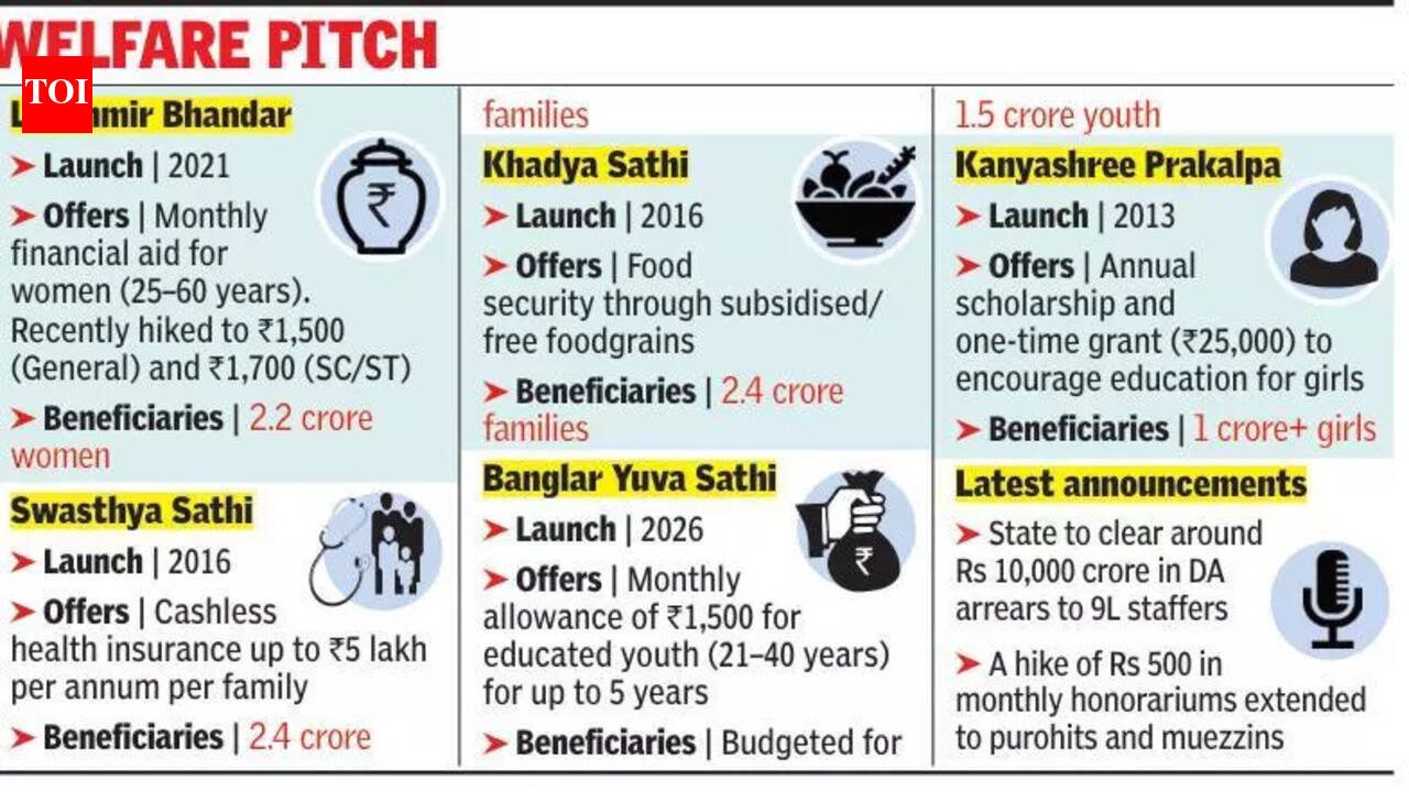 Kolkata: After hiking Lakshmir Bhandar amount and rolling out Yuva Sathi in the 2026 vote-on-account, CM Mamata Banerjee on Sunday put wind in Trinamool’s sail by announcing the DA arrears payout for state employees and hiking the monthly honorariums for imams and muezzins. These back-to-back steps, party seniors said, were aimed at offsetting any SIR-related fallout that party workers might have to battle until the late April elections.Even before the poll schedule was announced, mayor Firhad Hakim on Sunday began an election campaign in the Bhowanipore assembly constituency, which is represented by the CM. Hakim alleged that the BJP, if voted to power, would oppress the Bengali community and loot the state’s resources, adding that the very existence of Bengal was at stake. “BJP is coming here to oppress; it is coming to loot the state. Bengalis will be oppressed. Accounts will be settled, one by one. We tell our people that we must stand together, for we have to win back Bengal,” declared Hakim.Party seniors said that the four-and-a-half-month SIR phase has given them a chance to work closely with the people. Party spokesperson Kunal Ghosh said: “During the SIR process, people saw only Trinamool workers assisting voters. The BJP was nowhere to be found.”After the two-phase poll schedule was announced, the party appeared extremely confident. “Even if the polls had been announced in a single phase, we would have won. We are confident that Mamata Banerjee will return with a clear mandate for a fourth term, and our party will secure over 250 seats. With an eight-phase election, they managed only 77 seats. Even with a two-phase election, they will not get more than 27,” said Ghosh.The party is betting big on cash transfer schemes, which have re-emerged as the biggest talking point this poll season. When Lakshmir Bhandar — a monthly direct cash transfer scheme — was announced ahead of the 2021 poll season, it drew skepticism and occasional ridicule. But after her party rewrote electoral outcomes with it, the opposition chose to embrace the strategy aggressively. Despite occasional critique of “revdi” (freebie) politics, social schemes are now a permanent fixture as parties vie to win over women and economically vulnerable voters. The BJP, Congress, RJD, and AAP have all emulated such schemes.Economist Achin Chakraborty said welfare programmes provide crucial support to low-income households in a state where stable employment remains scarce. “The criticism that cash transfers discourage work does not hold strongly in this context,” he said. Chakraborty expressed concern about the youth allowance scheme, noting that identifying unemployed individuals in India is difficult because work is often irregular and self-reported. “As a result, a very large number of people could become eligible for a youth allowance, which may expand far beyond initial estimates and create a significant fiscal burden,” he added.