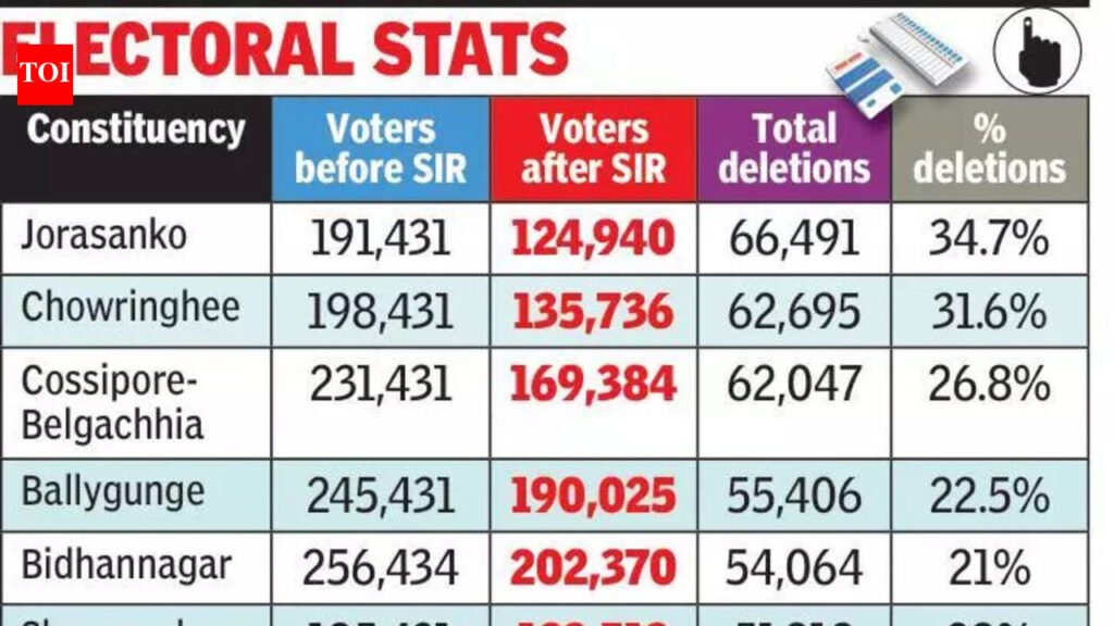 Kolkata: A reshaped Kolkata, with a much thinner voter roll, will go to the polls this year, infusing an unpredictability rarely witnessed before.For example, Jorasanko will go to polls with the SIR shaving off 35% of its 1.9 lakh voters, while Chowringhee’s 1.9 lakh voters were cut by 32%. Cossipore-Belagachia, Ballygunge, Bidhannagar, Shyampukur, Kolkata Port, Maniktala, and Rashbehari all witnessed over 20% of their voters being marked ‘deleted’. Though the percentages may be lower, Rajarhat-New Town, Tollygunge, Jadavpur and Bhowanipore will have over 40,000 fewer voters in their rolls. Sabir Ahamed, lead researcher at the Sabar Institute, said, “Our initial analysis of the draft roll shows that single male migrants — who played a significant role in running the city — in urban constituencies like Jorasanko, Bhowanipore, and Kolkata Port will no longer be able to vote where they spend most of their time, as they were either deleted or forcibly registered back to their native places. The top 5 Kolkata constituencies in the draft roll where deletions occurred for being untraceable or absent are Entally (59%), Jorasanko (55.1%), East Behala (47%), Jadavpur (46.5%), and Chowringhee (46.6%). These primarily have non-Bengali migrants and undermine the inclusivity of the city.” Among Kolkata assembly seats, women account for 42.5% of deletions in draft roll, compared to 53.6% across the state. The analysis of the draft rolls reveals that in Kolkata, 35% of female voter deletions took place for being ‘untraceable’ or ‘absent’, followed by 31.4% for being deceased and 31.8% for having permanently shifted. “The top 5 assembly constituencies in Kolkata and its adjoining areas with the highest proportion of female voters being deleted are Metiabruz, Rajarhat New Town, Behala Purba, Bidhannagar, and Kasba. In these constituencies, the average share of female deletions is 49.3%,” said Ahamed..Former Rabindra Bharati University VC Sabyasachi Basu Ray Chaudhury said, “The exclusionary process is antithetical to the democratic spirit and culture. The hastily conducted SIR was difficult to complete on time in Bengal. It may be recalled that in 2002, when the SIR was conducted, there were no impending elections.”At least 483 members of the Chinese community, whose names were in the 2002 list, were deleted from the 2026 draft voter rolls. Three-quarters of the deletions happened at Chinatown in Tangra, which straddles both Entally and Kasba constituencies, while the remaining 121 were from Tiretta Bazaar in Chowringhee constituency. Around 80% of the 484 Chinese Indians could not be traced; the rest were deceased. While deletions due to ASDD (Absentee, Shifted, Dead, Duplicate) and unmapping lists broadly match the Muslim share of the population in most Kolkata constituencies, logical discrepancy lists flag a disproportionately large share of Muslim voters. For example, the Muslim share of the population in Bhowanipore is around 20% as per the 2011 Census, but in the logical discrepancy list, 52% of those flagged are Muslims. Presidency University political science professor Zaad Mahmood feels that the 60 lakh cases under adjudication are concerning. “Analysis by Sabar Institute and others showed that Muslims are heavily represented in logical discrepancy lists. But it is not only Muslims; it is also women. So, 2 politically dominant core bases of the TMC seriously compromised, potentially facing the danger of disenfranchisement through the SIR.“