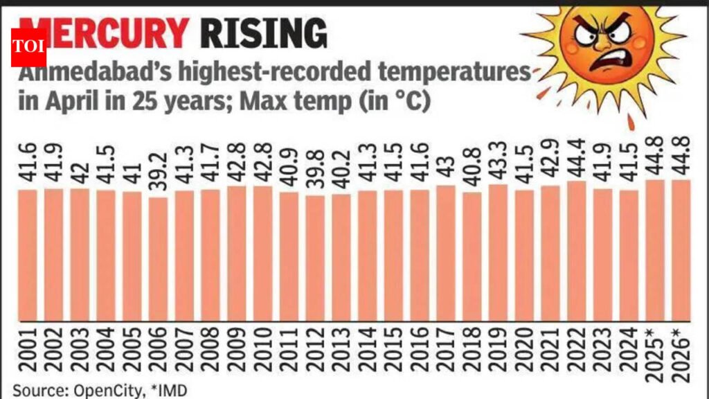 Ahmedabad: Amdavadis stepped out to vote on Sunday under one of its hottest April days in recent memory. The temperature climbed to 44.8°C, matching the same figure recorded on April 29 last year. This makes it one of the hottest April days in Ahmedabad in at least 25 years. Early April offered some respite. Since April 12, however, the city has seen 18 straight days above 40°C. Data shows that such extremes are becoming more frequent in the past five years. The shift is raising fresh concerns about urban heat and its growing impact on daily life. Long-term data suggests this is not just a one-off spike. According to temperature trends from the OpenCity portal, the average maximum temperature in April hovered around 41.5°C between 2001 and 2010, and 41.4°C between 2011 and 2020. During these two decades, the highest April temperature recorded was 43.3°C in 2019.The pattern has shifted sharply since 2021. In the past five years, April temperatures have crossed 44°C three times: 44.4°C in 2022 and 44.8°C in both 2025 and 2026. This has pushed the recent five-year average to 43.4°C, higher than earlier decades.Weather experts say March is relatively cooler as the temperatures start peaking after mid-March. “April is traditionally a transition month before peak summer in May, when temperatures usually hit their highest levels in Ahmedabad and Gujarat. However, multiple factors are now intensifying April heat. While overall temperatures are increasing in India, the rising heat in Ahmedabad has also to do with microclimatic factors. Urban heat island effects — where dense built-up areas trap heat — are making parts of Ahmedabad hotter than surrounding regions. Wind speed and direction are also influencing daily temperature swings,” said a weather analyst from Ahmedabad.Data from the India meteorological department (IMD) shows that this April has also seen erratic fluctuations. Western Disturbances have caused temperature variations of up to 3°C within a week, said senior Met department officials. At the same time, higher-than-normal minimum temperatures have reduced nighttime cooling, making it harder for the city to recover from daytime heat.