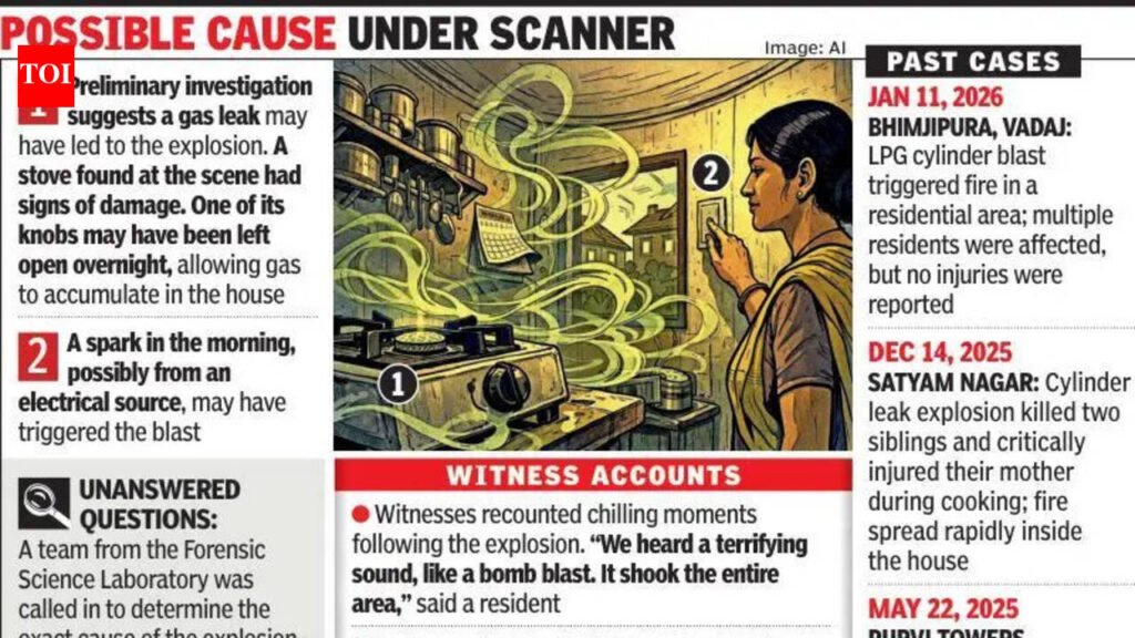 Ahmedabad: A gas cylinder explosion in Naranpura’s Chamundanagar area on Tuesday morning left five persons with severe burns and caused widespread damage to the house and nearby structures. The blast, which occurred around 5am, triggered panic among residents who said it sounded “like a bomb explosion”. The blast was so powerful that it ripped the iron door off the house and flung it into a house across the street.The blast shattered the windows of at least two nearby houses, jolting residents from their homes. Moments later, five occupants of the house, all with severe burns, ran towards the road pleading for help. Neighbours rushed to assist and tried to contain the fire until emergency responders arrived. Four of the five injured were identified as Raju Prajapati, 35; Hira Prajapati, 45; Manilal Kumawat, 46; and Sohan Kumar, 50.Locals played a crucial role in rescue operations. They shifted the injured to the hospital in 108 ambulances even before the fire brigade teams reached the spot. “We did whatever we could. First, we helped the injured and then tried to control the fire,” said a resident involved in the rescue.The explosion completely gutted the house. Clothes, bedding, groceries, footwear and electronic items were destroyed in the fire. The structure itself suffered heavy damage, with walls cracked and plaster peeled off. Nearby homes also sustained damage, primarily broken window panes, and reported structural vibrations resulting from the blast.Possible cause under scannerPreliminary investigation suggests a gas leak may have led to the explosion. A stove found at the scene had signs of damage, and one of its knobs may have been left open overnight, allowing gas to accumulate in the house.A spark, possibly from an electrical source in the morning, may have triggered the blast.Unanswered questionsA team from the Forensic Science Laboratory was called in to determine the exact cause of the explosion. Officials said a detailed scientific examination is underway.Authorities are also trying to ascertain details about the occupants and the ownership of the house, including whether the victims were tenants.Eyewitness accountsEyewitnesses recounted chilling moments following the explosion. “We heard a terrifying sound, like a bomb blast. It shook the entire area,” said a resident.Another eyewitness said, “When we opened the door, we saw people running out of the house with severe burns. We immediately rushed to help them.”Residents also removed gas cylinders from nearby houses, fearing further explosions, and attempted to douse the flames using available resources.Pointers:• Jan 11, 2026 – Bhimjipura, near Vadaj: LPG cylinder blast triggered fire in a residential area; multiple residents were affected, but no injuries were reported.• Dec 14, 2025 – Satyam Nagar: Cylinder leak explosion killed two siblings and critically injured the mother during cooking; fire spread rapidly inside the house, highlighting deadly indoor gas leak risks.• May 22, 2025 – Purvi Tower, Gurukul Road: AC blast triggered fire followed by two cylinder explosions; over 20 residents rescued from high-rise, no casualties but major damage to two flats.