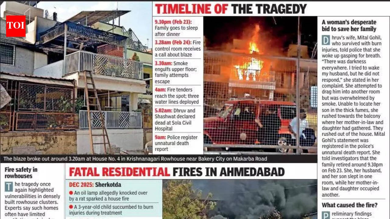 Ahmedabad: A routine night’s sleep turned into an unimaginable tragedy in the early hours of Feb 24, when a fire tore through a row house in Vejalpur, killing a 39-year-old man and his 9-year-old son, while three other family members managed to escape.The blaze broke out around 3.20am at House No. 4 in Krishnanagari row house near Bakery City on Makarba Road. The Gohil family — five members across two generations — went to bed after dinner. Within hours, thick smoke began filling the upper floor where they were sleeping.According to an accidental death case filed at Vejalpur police station, the tragedy occurred between 3.20am and 5.02am. The deceased were identified as Dhruv Gohil, employed with a private factory in Changodar GIDC, and his son Shashwat, a Class 4 student.The three women, including Dhruv’s wife, Mital Gohil, climbed down through a neighbouring house and reached the society compound as flames intensified below. Residents alerted the fire brigade at 3.28am. Fire officials later said the ground-floor hall appeared to be the point of origin, with preliminary suspicion pointing towards a short circuit or a possible spark from an air-conditioning unit.Firefighters entered the house amid near-zero visibility and pulled out Dhruv and Shashwat unconscious. Both were rushed to Sola Civil Hospital at 5.02am along with Mital, where Dhruv and Shashwat were declared dead, and Mital was undergoing treatment.Police registered an accidental death case under Section 194 of the BNSS. A forensic examination is underway to determine the precise cause of the blaze.A woman’s desperate bid to save her familyDhruv’s wife, Mital Gohil, who survived with burn injuries, told police that she woke up gasping for breath. “There was darkness everywhere. I tried to wake my husband, but he did not respond,” she stated in her complaint. She attempted to drag him into another room but was overwhelmed by smoke. Unable to locate her son in the thick fumes, she rushed towards the balcony, where her mother-in-law and daughter gathered. They rushed out of the house. Mital Gohil’s statement was registered in the police’s unnatural death report. She told investigators that the family retired around 9.30pm on Feb 23. She, her husband, and her son slept in one room, while her mother-in-law and daughter occupied another.Timeline of the Tragedy• 9.30pm (Feb 23): Family goes to sleep after dinner• 3.28am (Feb 24): Fire control room receives a call about blaze• 3.30am: Smoke engulfs upper floor; family attempts escape• 4am: Fire tenders reach the spot; 3 water lines deployed• 5.02am: Dhruv and Shashwat declared dead at Sola Civil Hospital• 9am: Police register unnatural death reportWhat caused the fire?Preliminary findings suggest the blaze may have originated at the ground-floor hall due to an electrical short circuit. A senior fire officer indicated that a spark in an air-conditioning unit cannot be ruled out. However, officials emphasised that the exact cause will only be confirmed after forensic analysis. Investigators are examining wirings, electrical fittings, and appliances recovered from the debris. Police registered the case under Section 194 of the BNSS, pertaining to unnatural death, and forwarded documents for further inquiry. Fire officers and police said smoke inhalation likely rendered the victims unconscious before flames intensified.Fire safety in row housesThe tragedy once again highlighted vulnerabilities in densely built row-house clusters. Experts say such homes often have limited ventilation and single-exit staircases, increasing risk during night-time fires. Fire officials stress the importance of installing smoke detectors, maintaining electrical wiring, and ensuring accessible emergency exits. Regular inspection of air-conditioners and high-load appliances is also recommended. Residents of the society gathered later in the day to discuss preventive measures and emergency response coordination. For many, the tragedy became a grim reminder that fires spread rapidly — and smoke can turn fatal within minutes.
