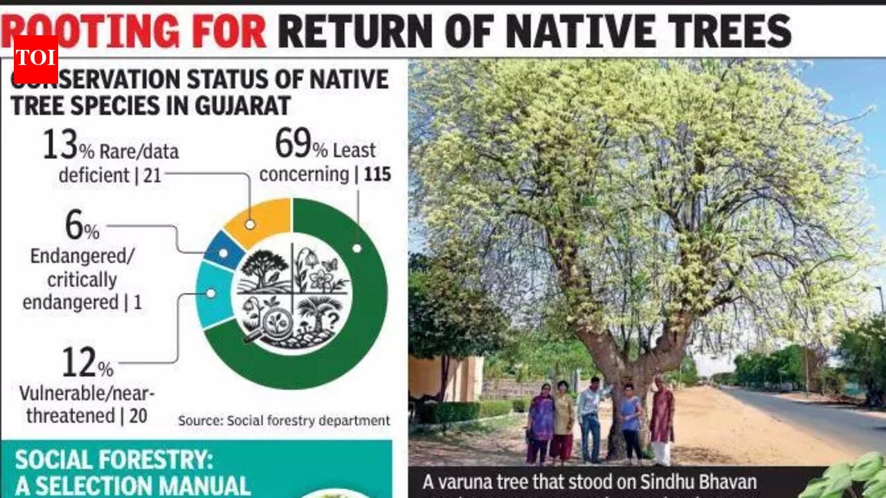 Ahmedabad: The city’s green cover is expanding, but its ecological strength may be weakening. Native trees that once anchored biodiversity are vanishing. They are being replaced by fast-growing or ornamental trees that fail to sustain the local ecosystem of insects, birds and pollinators. Experts say this shift could disrupt entire food chains. The sign is clear: not all green cover is equal.Around six decades ago, Ahmedabad was home to several vulnerable and endangered native trees such as varuna (Crataeva nurvala), tree caper or pachunda (Capparis grandis), and pilu (Salvadora persica). Officials recall a large varuna tree on Sindhu Bhavan Road that, along with the biodiversity it supported, was lost to development.Minal Jani, deputy conservator of forests (social forestry) in Ahmedabad, said such trees play a crucial ecological role. The varuna tree was an anchor for four different species of butterflies, she said, adding: “When the tree is no longer there, the butterflies, along with other insects, also vanish. Tree caper, likewise, is known to be a host for 16 different insects. When these trees disappear, we do not lose just the green canopies, but also the biodiversity it sustained.”She adds, “The native species are often replaced by neem, banyan and peepul trees or exotic species such as kigelia, lagerstroemia, tabebuia, etc. They do not share the same relationship with the biosphere.”Officials stressed that many species depend on specific plants. For instance, Indian birthwort (Aristolochia indica) is the only host for common rose and crimson rose butterflies, while dhavadi or fire flame bush (Woodfordia fruticosa) supports birds, bees and small mammals. She appealed that whenever there is a tree plantation drive, using native species yields much better results. She was speaking on the sidelines at the launch of ‘Curating Gujarat’s True Canopy’, a guide to native trees released by the state forest department on Friday. The department also organised an exhibition showcasing seeds and information on these species.Dr A P Singh, head of the forest force in Gujarat, said invasive species such as gando baval and eucalyptus have spread rapidly and need to be removed, especially from riverbanks, to restore ecological balance. He added, “The state offers incentives of Rs 5,000 to farmers to discourage cutting native trees.”Even as tree numbers increase, natural forests that have existed for centuries continue to decline due to urban expansion, said officials. Ahmedabad’s tree count doubled from 6.18 lakh in 2011 to 12 lakh in 2025, but experts say this growth must include native species to sustain biodiversity.According to the department, of 166 native species identified in Gujarat, 115 (69%) fall under least concern, 20 (12%) are vulnerable or near threatened, 10 (6%) are endangered or critically endangered, and 21 (13%) are classified as rare or data deficient.