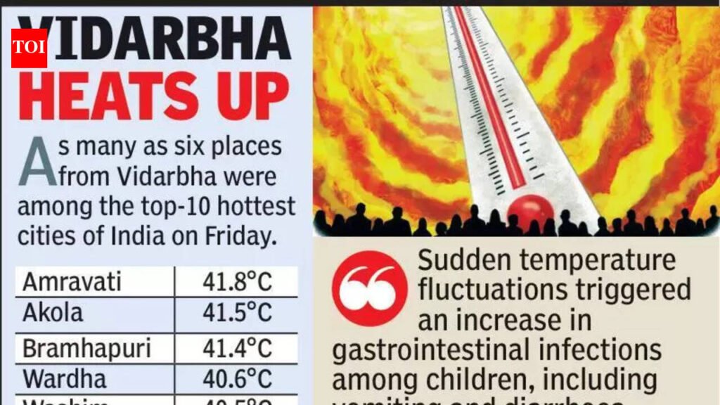 Nagpur: Vidarbha continued to reel under an intense heat spell on Friday, with Amravati recording the highest maximum temperature in the country for the second consecutive day. The city touched 41.8°C, making it not only the hottest place in India but also the 13th hottest location in the world, according to weather data. At least six places in Vidarbha crossed the 40°C mark, placing them among the top 10 hottest locations in the country. These include Amravati (41.8°C), Akola (41.5°C), Wardha (40.6°C), Yavatmal (40.4°C), Washim (40.5°C) and the sub-district station Bramhapuri (41.4°C).Even Nagpur recorded a maximum temperature of 39.4°C, remaining close to the 40°C mark as the region experienced persistently high temperatures for the past several days. Meteorologists indicated that Vidarbha is currently witnessing a heatwave-like spell, though some relief may be on the horizon. Weather models suggest rain, gusty winds and thunderstorms over the weekend, which could temporarily break the ongoing heat spell across parts of the region.Citizens said the current dry conditions and intense afternoon heat are leading to dehydration, fatigue and uneasiness, forcing many people to stay indoors during peak hours. Those who have to step out for work said the sharp variations between hot afternoons and relatively cooler indoor environments are making them feel unwell. Doctors also reported a rise in seasonal infections. Paediatric pulmonologist Dr Vivek Charde said the sudden temperature fluctuations triggered an increase in gastrointestinal infections among children, including vomiting and diarrhoea. “Some sporadic cases of chickenpox were also reported. The rising temperature increased the viral load, leading to respiratory distress among children. Asthmatic kids who do not strictly follow inhaler protocols are facing greater discomfort,” he said. Dr Charde added that patients from rural areas and nearby districts, including Amravati, are being referred to Nagpur for clinical management. With rainfall expected over the weekend, he cautioned that viral infections could see a further spike in the coming days.