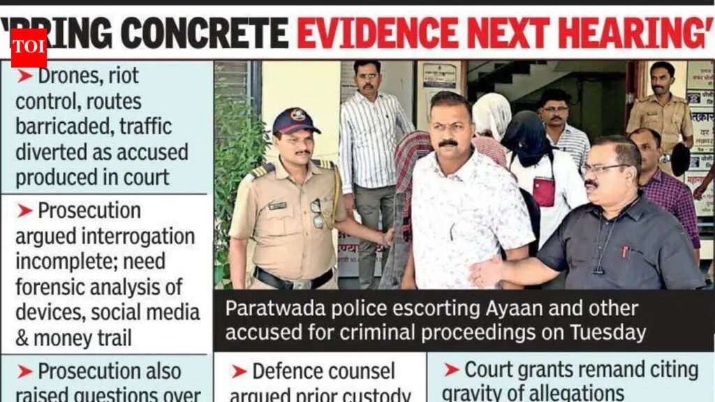 Achalpur (Amravati): The police custody of Amravati sex scandal key accused Ayaan Ahmed and three others was extended till April 27 on Tuesday by Achalpur district sessions court, which rapped the cops for the slow pace of probe.The accused were produced under heavy security that for the first time saw deployment of drones over the court and its vicinity, providing an extra layer of surveillance to the multi-layered security on the ground that included local cops, a platoon of riot control police and members of SIT.The route through which the accused were brought to court was barricaded at crucial junctions and traffic diverted during convoy movement. Apart from Ayaan, the three other accused produced in court were Uzer Khan, Mohammad Saad and Tabrez Khan.Public prosecutor Dhanraj Navale argued that custodial interrogation of accused was not complete, mobile phones of accused required advanced forensic analysis and social media uploading of obscene content needed technical analysis. Financial transactions of the accused also need to be scrutinised to trace money trail, he added.He also flagged the source of funds behind Ayaan’s possession of a luxury SUV and a weapon allegedly found in the vehicle. Defence counsel Waqar Ahmad, appearing for Ayaan, opposed the remand plea. He argued police were already granted seven-day custody, but failed to recover substantial evidence. Data recovery exercise in Amravati and Nagpur yielded no incriminating material, he said, terming the grounds for fresh custody repetitive and legally unsustainable. He also submitted that the alleged weapon found in the SUV was not a firearm, but an air gun used for agricultural purpose.The court, while directing police to present concrete evidence at the next hearing, granted remand given the seriousness of the allegations in the matter.On the digital evidence front, apart from five mobile phones seized, six more phones, a laptop, one tablet and a hard disk have been sent to the forensic laboratory for analysis. Of the devices already examined, 18 videos and 39 photographs involving eight survivors were found. Police again appealed to survivors’ families to come forward without fear, assuring confidentiality with legal precautions to protect their identity.