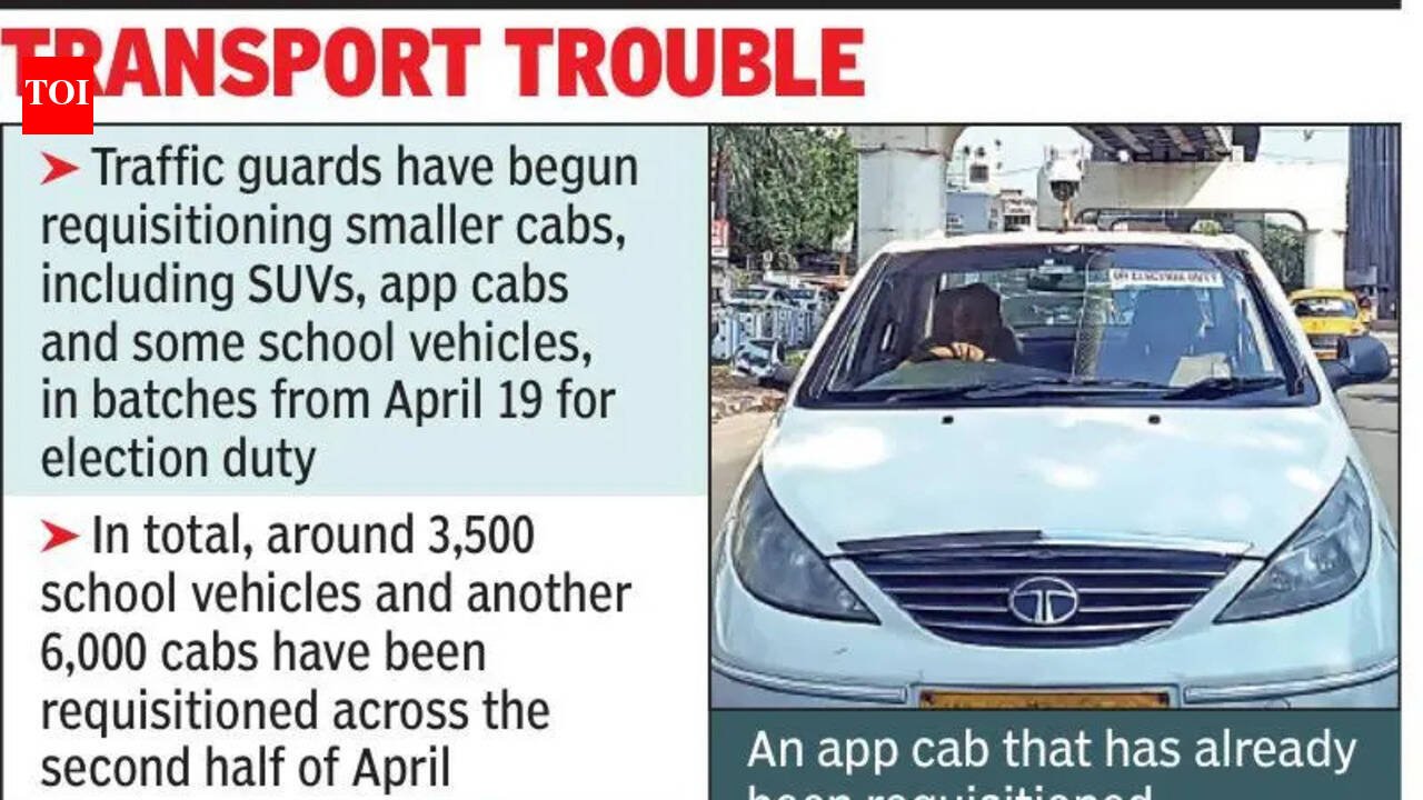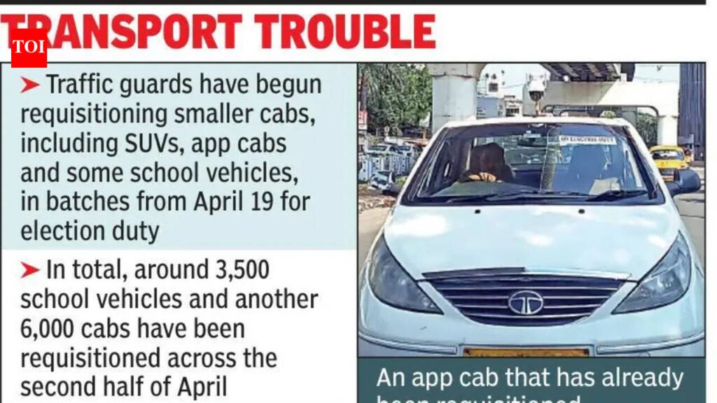 Kolkata: Traffic guards are requisitioning smaller cabs — comprising app and those used to ferry students — from April 19 in batches. In total, around 3,500 school vehicles and another 6,000 cabs have been requisitioned over the second half of April.According to transporters, this will affect the overall transport system till the end of April, with buses going off the road for election duty and autos facing a severe fuel crisis.The requisition of these vehicles began almost more than 45 days ago. “We have already requisitioned the vehicles. Now that the DEOs have launched the app, we are feeding our requisition data and calling up the car owners and setting them the dates on which they need to report. With elections in just two phases, the requirement is abnormally high,” explained an officer. Cops said the use of the Sugam app has made the process error-free, with data widely available to all.“Our cars are being taken by both police and the RTO. Cops are asking them from April 19 and the cars will be released by April 25. Force commandants will alone use around 450 such vehicles. Another 1,000 have already been requisitioned for other purposes. Around 150 are presently being used in Kolkata and around. For the second phase, beginning April 25, around 3,000 app cabs will be used,” said Indranil Banerjee, the convener for West Bengal Online Cab Operators’ Guild. Arupam Dutta from the Poolcar Owners’ Welfare Association said around 3,500 of their vehicles have been requisitioned, mostly by cops. In addition to the requisitioned 3,500 pool car vehicles, another 150-odd vehicles have already been requisitioned from the school sector, claimed sources, adding most schools would reopen by April 13. “My pool car driver has asked me that services will be unavailable between Aril 27 and 31. I am already making alternative plans,” said Sangita Banerjee, a resident of Jodhpur Park.Meanwhile, cops claimed they are coming across cars with stickers of ‘booked’ pasted on them. However, not all of them have been requisitioned legally. In several cases, fake ‘EC papers’ have been used.