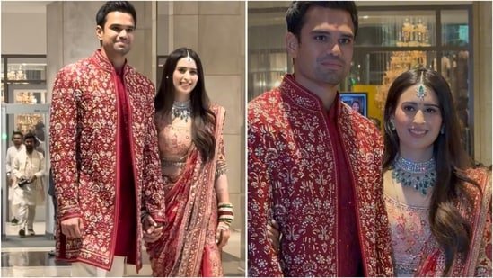 Arjun Tendulkar and Saaniya Chandhok are officially married. The son of cricket legend Sachin Tendulkar tied the knot on March 5 in a spectacular, star-studded ceremony in South Mumbai. The high-profile celebrations brought together India’s cricketing icons, Bollywood celebrities, business magnates, and socialites, making it one of the most talked-about weddings of the year. After much anticipation, the couple’s wedding looks are finally revealed, and they are nothing short of spectacular. Let’s take a closer look at what they wore. (Also read: Ambani ‘badi bahu’ Shloka Mehta wows in contemporary ethnic look alongside Akash Ambani at Arjun Tendulkar’s wedding )