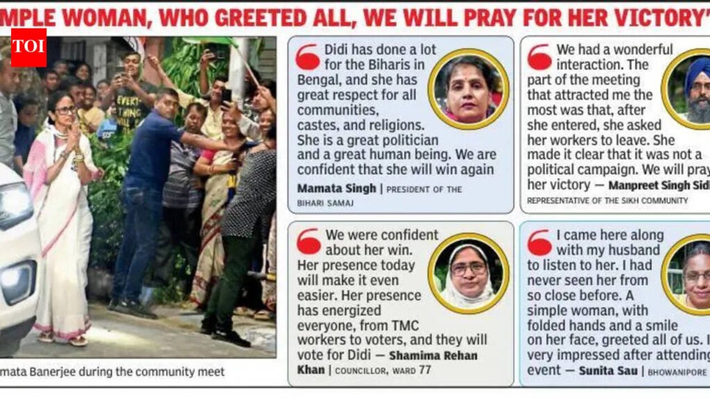 Kolkata: “Election is the festival of democracy and not autocracy,” said CM Mamata Banerjee at a community meet at Ladies’ Park in Bhowanipore where representatives from different communities had gathered on Sunday evening. Speaking before a packed audience, Banerjee urged those present to remain united and carry her message back to members of their respective communities.Voters and representatives of Christian, Muslim, ISKCON, Sindhi, Gujarati, Jain, Sikh and Bihari communities were present. The venue was decorated with Trinamool Congress flags, and people began entering the park from around 3.30 pm. The first three rows were reserved for community representatives, including several priests from churches.Banerjee arrived around 6 pm, when the park was already full. She greeted those present with folded hands and met representatives seated in the front rows. She then walked towards the main gate to greet local residents. Although a chair had been arranged for her on the dais, she chose instead to sit in front of the audience with a hand microphone and began her speech by apologising for the delay, saying she had come directly from Tarakeswar.In her address, Banerjee alleged that around 300 nuns had their names deleted during the SIR process. She also claimed that voters from Muslim, Bihari and Gujarati communities had been removed from the roll without any reason. Referring to the debate over the women’s reservation bill, she accused the BJP of trying to divide people on the basis of caste, creed and community.She also criticised recent raids and naka checking, saying ordinary people were facing severe harassment. Banerjee alleged that even the Russian consulate had been troubled in the name of checking and claimed that an artist returning from work had also been harassed. “Are they running a country? This can’t go on for long,” she said.Addressing members of the Gujarati community, Banerjee questioned why Prime Minister Narendra Modi and Union home minister Amit Shah had remained silent when Indian migrants were allegedly deported from the United States in chains and handcuffs. She accused the BJP of trying to capture Bengal by force and alleged that central forces, money and muscle power were being used in the state because of political fear.Banerjee further claimed that 32 lakh deleted voters had already been restored to the rolls and said the remaining names would be included soon. She assured the gathering that people of all castes, creeds and religions could practise their faith freely in Bengal and said she had personally attended many community functions to strengthen social harmony.After her speech, representatives from Christian, Muslim, Sindhi and Jain communities voiced support for Banerjee and said they hoped to see her return as chief minister for a fourth term. Rev. Martine, representing the Christian community, said, “We are with you, Didi, and we will all pray for your victory this time too.” The hour-long meeting ended at 7 pm with chants of “Joy Bangla” from the crowd.
