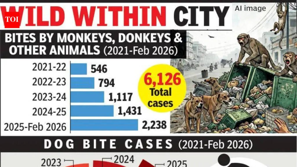 Nagpur: The city has recorded average over three bite cases every day from monkeys, donkeys and other animals in the last five years, signalling a growing but often overlooked public health concern. Data provided by the Nagpur Municipal Corporation (NMC) in an RTI reply shows that 6,126 such cases between April 2021 and February 2026, with numbers rising sharply each year and peaking in the current financial cycle.Officials attribute the spike in such cases to increasing human-animal conflict, driven by factors such as open garbage dumps, easy access to food waste, and shrinking natural habitats. Monkeys and stray animals like donkeys are frequently seen entering residential areas, often turning aggressive when confronted, they said.The data, obtained by RTI activist Abhay Kolarkar, also underscores the larger animal bite burden in the city. Nagpur also reported 44,660 dog bite incidents leading to 9,946 injuries, while eight rabies deaths were recorded during the same period.In response to queries on action against stray animals at sensitive locations like railway stations and courts, NMC stated that no animals were picked up or relocated, pointing to gaps in enforcement despite mounting risks. The data pertaining to monkey and donkey bites reveals a consistent surge. Cases increased from 546 in 2021-22 to 794 in 2022-23, before reaching 1,117 in 2023-24. The upward trend continued with 1,431 cases in 2024-25, while the current year has already reported 2,238 cases till February 2026. The focus of the Animal Birth Control (ABC) programme is limited to controlling stray dog populations. Between May 2023 and Feb 2026, NMC sterilised 69,389 dogs, with an almost equal number of male and female, across centres at Bhandewadi, Gorewada and Maharajbagh.Public health experts say while this may help stabilise dog populations over time, it does little to address the rising incidents involving monkeys and stray livestock. Experts warn that animal bites can lead to serious infections and also carry the risk of rabies if not treated promptly. They called for a broader and coordinated animal management strategy — including better waste management, monitoring of monkey populations, and stronger inter-departmental coordination.INFOBOX: # Bites by Monkeys, Donkeys & Other Animals (2021-Feb 2026)2021-22: 5462022-23: 7942023-24: 1,1172024-25: 1,4312025-Feb 2026: 2,238Total: 6,126 cases# Dog Bite Cases & Injuries (2021-Feb 2026)2021: 5,800 | Injured: 1,4842022: 8,317 | Injured: 2,1342023: 9,110 | Injured: 1,8772024: 9,429 | Injured: 1,8412025: 10,944 | Injured: 2,173Jan-Feb 2026: 1,060 | Injured: 437Total: 44,660 cases | 9,946 injured# Animal Birth Control (ABC) – Dog Sterilisation (May 2023-Feb 2026)Vets For Animals, Satara (Bhandewadi Centre): Male – 15,194 | Female – 16,394 | Total – 31,588 Krishna Society For Animals, Pune (Gorewada Centre): Male – 15,619 | Female – 12,782 | Total – 28,401 Swatantra Animal Welfare Society (Maharajbagh Centre): Male – 4,451 | Female – 4,960 | Total – 9,400 Total: Male – 35,264 | Female – 34,136 | Grand Total – 69,386