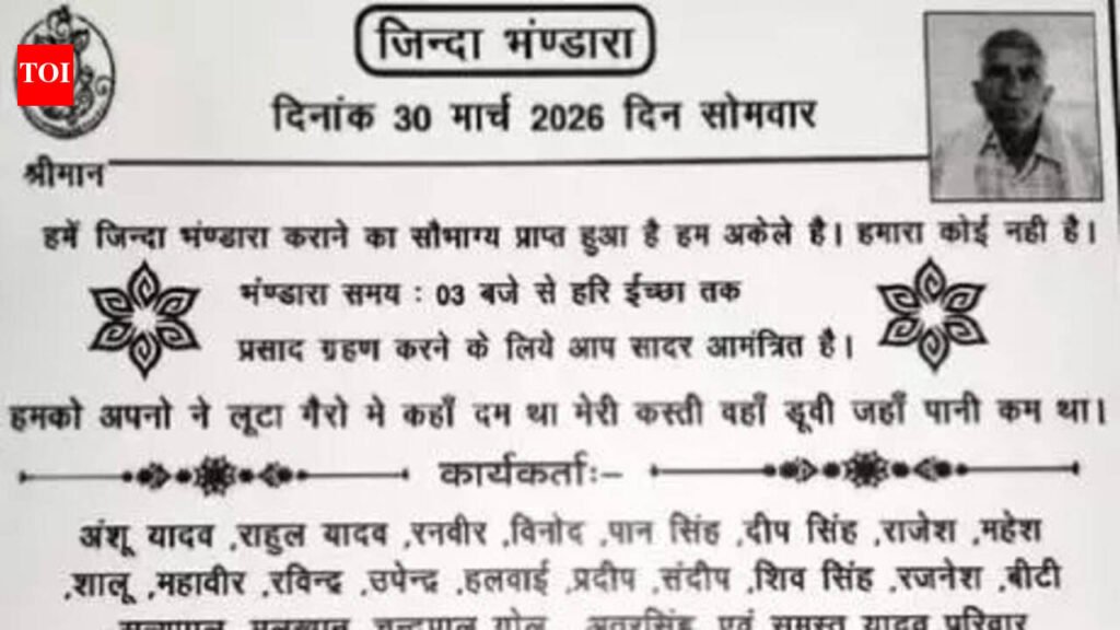 Kanpur: In a bizarre case, a 64-year-old man from Lakshmanpur village in Auraiya district threw a curveball at tradition. Defying the conventional norm of holding ‘terahvi’ feasts posthumously, Rakesh Yadav decided to celebrate it while still being alive. The grand affair on Monday saw a whopping 1,900 guests from the village and surrounding areas, leaving everyone stunned.Yadav’s reasoning behind this unusual move was twofold — he confided in the locals that he wanted to combat loneliness. More poignantly, he suspected his relatives might skip the traditional ‘terahvi’ ritual due to financial pressures. To spare anyone trouble, he took matters into his own hands and hosted the event himself.As a bachelor, he was apprehensive about care in old age. His decision sparked a debate in the village. However, he clarified that the event was merely a feast, with no religious rites or ‘pind daan’. Yadav, who frequently attended ‘terahvi’ feasts in the village, said he wanted to have a feast in his own honour while he was still alive. He got formal invitation cards printed and distributed them among the villagers. The card stated, “Invitation for a living ‘terahvi’. I am alone, with no one for me. I am fortunate to hold my ‘bhandara while alive’. It also included a couplet: “Hamein apnon ne loota, gairon mein kahan dam tha, meri kashti wahan doobi jahan paani kam tha.” The sexagenarian, who receives an old-age pension, organised the feat using his savings. Yadav’s youngest brother, Chandrapal, died after a long illness, and his second brother, Naresh Yadav, was murdered. None of the brothers was married. They have one sister, who is married. He mentioned donating his ancestral home to a relative and living in a simple hut himself. Villagers were left baffled upon receiving the invitation card, with a local Anuj admitting they initially suspected a printing error or a prank, given Rakesh’s very much alive status, seen strolling around the village post-card distribution. “We were surprised… But, we attended his ‘terahvi’ feast to honour his feelings and prayed for his long life,” he said.