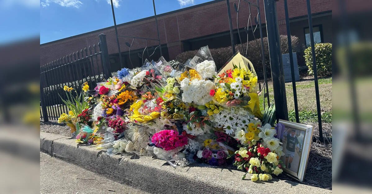 Students and Hughes’ fellow teachers left a makeshift memorial of flowers along a section of fence outside the school.