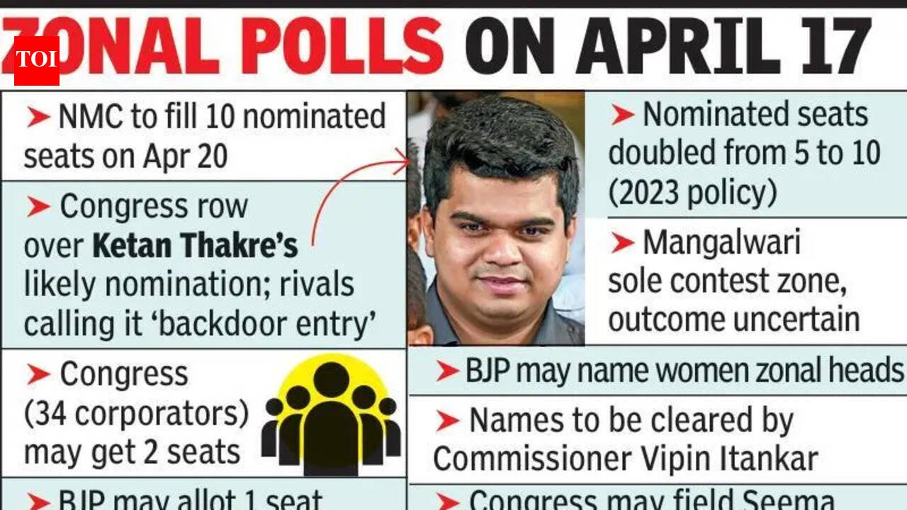 Nagpur: Nearly 3 months after civic polls, Nagpur Municipal Corporation (NMC) is set to fill 10 nominated corporator posts in the April 20 general body meeting, with the ruling BJP poised to further cement its dominance in the House. Backed by 102 corporators, BJP is expected to secure seven of the 10 seats, reflecting its overwhelming numerical strength.The political spotlight, however, has shifted to the Congress camp — where likely nomination of city Congress president Vikas Thakre’s son Ketan — has triggered sharp reactions, with rivals terming it “backdoor entry” into electoral politics.Ketan, who did not contest the recent civic polls, is among the frontrunners for nomination. Sources said he was initially expected to contest from the Dharampeth zone but chose to stay away amid apprehensions of a tough contest. His possible entry through nomination is being viewed as a strategic move by Congress to induct him into active politics without facing the electoral test. Party insiders, however, argue that nominations are meant to recognise organisational work and public connect, not merely electoral victories.Businessman Atul Kotecha, also in fray from Congress, with the party, which has 34 corporators, likely to secure 2 nominated seats.As part of alliance adjustments, BJP is expected to allocate one nominated seat to its ally, Shiv Sena (Shinde), while AIMIM, with six corporators, is set to get one seat. From the BJP, the names of Sanjay Thakre, Jitu Thakur, Subodh Acharya, Ritesh Gawande, Devendra Meher, and Vinod Baghel are almost considered final. BJP alone has reportedly received more than 700 applications, while the Congress has seen more than 300 aspirants. Sources said BJP has finalised names of 6 nominated corporators.Zonal chairperson polls will be held on April 17. While BJP is comfortably placed in 8 zones, Congress in Mangalwari, Ashi Nagar remains sole battleground. Like chairpersons of all committees, BJP may nominate women corporators to head the zones. Even Congress may nominate Seema Dawre as Mangalwari zone chairperson.