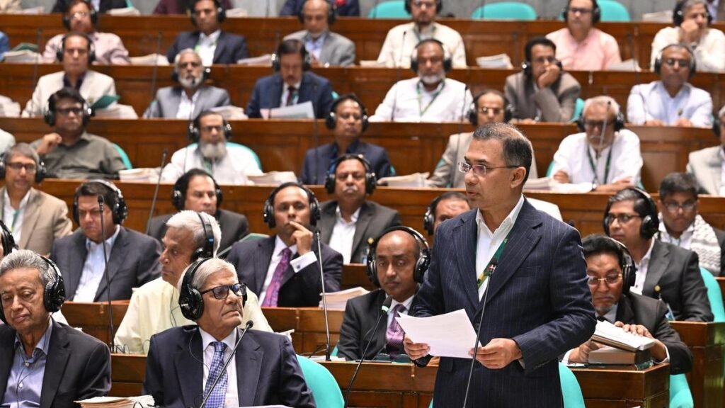 Bangladesh Prime Minister Tarique Rahman speaking during a parliamentary session in Dhaka.