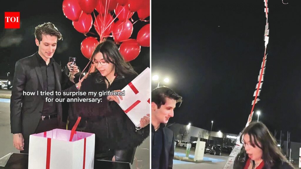 Oops… there goes my salaryIn the now-viral clip, the pair open the gift with peak energy. Within seconds, the balloons – tied to a string stacked with cash – make a dramatic exit and float into the great beyond. As the woman leans in for a hug, the man enters operational meltdown. A frantic chase follows, but gravity and good luck are both off duty. The aftermath is brutal: he collapses onto the road, face in hands, repeating the line no payroll department wants to hear in public — that was his salary. She attempts damage control, first with reassurance that intention matters, then with a hustle-culture solution: earn more.Some laugh while one criesNetizens couldn’t resist. Comments ranged from “That’s one way to give your salary wings” to “Plot twist: love cost you more than ₹2 lakh.” Some joked that the money was “doing its own anniversary getaway,” while others declared it the most Indian romantic fail meme of the year.