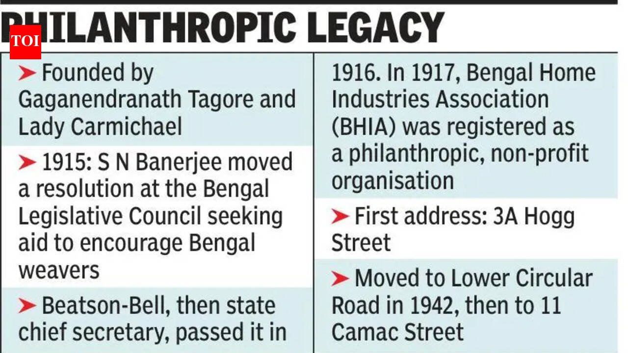Kolkata: The Bengal Home Industries Association, founded by Rabindranath’s nephew Gaganendranath Tagore and Lady Carmichael (wife of the then governor), has turned 110, surviving the test of time, multiple changes of address and stiff competition from the cottage industry market across India and abroad.On Tuesday, to celebrate a century and a decade of its existence, Bengal Home Industries Association, said to be Bengal’s first handloom and handicraft store, organised a workshop of the artisans whose creations have been adorning its shelves. “I have never visited a store like this, which has been promoting West Bengal’s cultural heritage for more than a century,” said Barbara Voss, German consul-general in Kolkata. “I especially like the idea and the efforts so that the crafts and works of people of West Bengal do not die. Never before have I seen how artisans make it,” the consul-general said.Lady Carmichael, wife of the then governor, Thomas David Gibson-Carmichael, also supported the project, which explains the “Carmichael Duck” logo on the signature pottery or clay craft items on the shelves.G M Kapur, president, Bengal Home Industries Association, said, “BHIA, founded in 1916-1917 in Kolkata (then Calcutta) by leading citizens like Gangendranath Tagore and Lady Carmichael, aimed to revive and support cottage industries and Bengal handicrafts in Bengal, offering fair prices to artisans. All these years, BHIA has been promoting Bengal’s crafts, including handlooms, dokra, terracotta, and Tangail, Dhaniakhali, Phulia weaves from regions like Hooghly, Midnapore, Birbhum, Bankura and other Bengal districts. We are now into exchange agreements with Indian states and showcasing traditional art and craft.”The genesis of the heritage store, which showcases creations of artisans from all districts of Bengal, started in 1915 at the Bengal Legislative Council, when Surendranath Banerjea moved a resolution seeking aid to encourage Bengal weavers. Beatson-Bell, then state chief secretary of the British-ruled govt, passed the resolution in 1916. Subsequently, Bengal Home Industries Association was registered as a philanthropic, non-profit organisation. Housed at several rented places over the last 110 years, it has found its permanent home at the junction of Rashbehari Avenue and Lake Road.In the aftermath of the Partition of Bengal, which revealed the plight of the artisans like never before, on the sidelines of their respective professions, Surendranath as the founder of the Indian National Congress and Gaganendranath Tagore, whose creative contributions defined Bengal’s cultural history, agreed that something constructive needs to be done. On the same page was Abanindranath Tagore, pioneer and leading exponent of the Bengal School of Art.