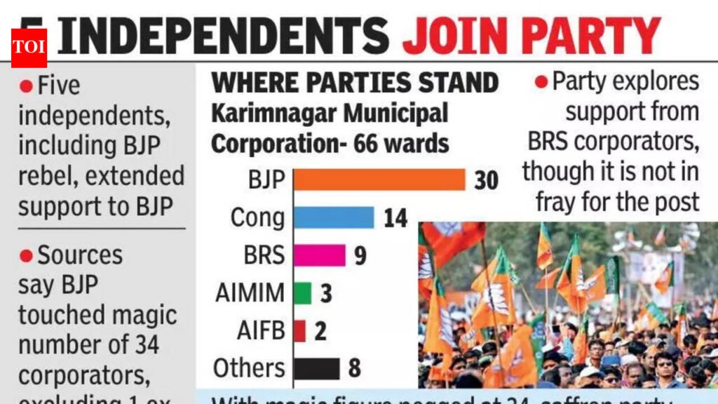 Hyderabad: After a high-voltage civic battle, the BJP has swiftly moved to consolidate numbers in Karimnagar, positioning itself within striking distance of the mayor’s post.In a rapid post-result manoeuvre, five independents, including a BJP rebel, extended support to the party. Two independent corporators formally joined the BJP in the presence of Union minister of state for home and Karimnagar MP Bandi Sanjay on Saturday evening, while others had joined earlier. Party sources said the BJP has now touched the magic number of 34 corporators, excluding one ex-officio member. Emerging as the single largest party in the 66-division Karimnagar Municipal Corporation, the BJP won 30 seats, ahead of Congress (14), BRS (9), AIMIM (3), All India Forward Bloc (2) and eight independents. With the magic figure pegged at 34, the saffron party needed four more corporators to clinch the mayor post.Sources said that soon after counting concluded on Friday, the BJP shifted its corporators to a farmhouse near Shamirpet. Some independents also joined the party there. Sanjay, who is overseeing the Karimnagar elections, reportedly held talks with independents to secure their backing in the mayoral polls. The party is also said to be exploring support from BRS corporators, though the pink party, with nine divisions, is not in the fray for the mayor’s post. Nizambad scenarioWhile the outlook appears favourable in Karimnagar, the picture is less promising for the BJP in Nizamabad. In the 60-division Nizamabad Municipal Corporation, the BJP secured 28 seats, Congress 17 and AIMIM 14, while BRS won just one. With 31 required to win the mayoral post, sources in the BJP conceded that Congress and AIMIM together hold a clear advantage. In Nizamabad, the BJP has three ex-officio members — Lok Sabha MP Dharmapuri Arvind, Nizamabad Urban MLA Dhanpal Suryanarayana Gupta and Armoor MLA P Rakesh Reddy. However, Congress too has four ex-officio members within the corporation limits, including MLC B Mahesh Kumar Goud and MLA R Bhoopathi Reddy, strengthening its position in the mayoral contest.