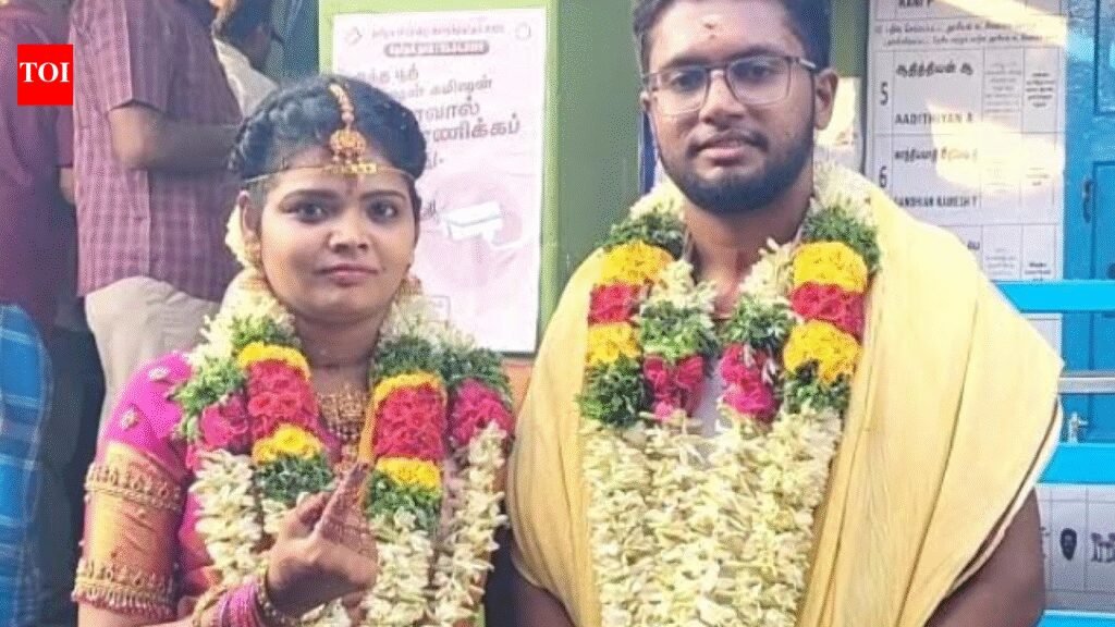 NAMAKKAL: The indelible ink applied on her right index finger added to the beauty of the henna on her hands. Casting her vote was the first thing that Deepika of Kosavampatti in Namakkal district did after her wedding on Thursday morning. Deepika and the groom, Anand of Tirupur, walked straight to polling station wearing garlands. She cast her vote while he waited outside. Deepika said, “It is my right and responsibility to vote. Even though today is my wedding day, I wanted to make sure that I fulfilled this duty before anything else.” What about Anand’s vote? Well, they were heading to Tirupur, around 60km away, where he would cast his vote.