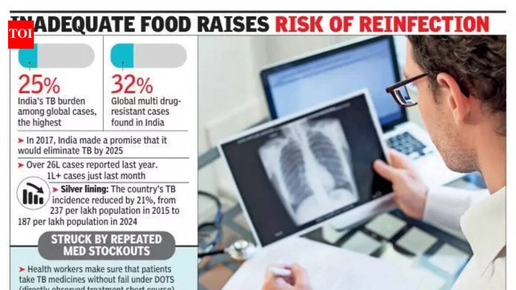 Mumbai: When 30-year-old Fatima (name changed) was diagnosed with drug-resistant (DR) TB in Jan last year, her doctors were clear: Missing a dose or skimping on nutrition wasn’t an option. The Govandi resident handed over her bank details to health workers, trusting the central govt’s promise of Rs 1,000 per month for nutrition. It was soon broken.Apart from two transfers of Rs 3,000 each in March and June, Fatima was left to fight the disease on an empty stomach for half the year. Like her, 39,164 patients in Mumbai were left high and dry all through 2025—India’s promised deadline for TB elimination—as just 9,800 were paid their dues. A TB specialist from Govandi, who has worked with top officials on several policy initiatives, said, “We now tell patients in the early stages of treatment itself that the money will eventually reach them, but we clarify there is no telling when.” Launched in 2018, Nikshay Poshan Yojana (NPY) was an acknowledgement that food intake is an essential part of TB treatment. At the time, Rs 500 per month was locked in as nutritional support; last year, this was increased to Rs 1,000. As per central TB division’s (CTD) latest data, 1.38 crore TB patients in the country have been paid Rs 4,453 crore since 2018. In the same period, 1.64 crore patients have been diagnosed, but over 26 lakh have been left out of the scheme. India reported as many fresh TB cases last year. CTD officials refused to comment. Soham (29) (name changed), a Thane resident, stopped receiving the sum long ago, after he asked for a change in his bank details. He was first diagnosed with multi-drug resistant TB in 2022 but missed his medication several times due to external circumstances. Standard drug-sensitive TB is treated for six months, while DR-TB treatment can last 18-24 months. Although the recently rolled out regimen shortens DR-TB treatment to just 6-9 months, it is yet to take over and cannot be given to extra-pulmonary TB cases. India reports around 1.3 lakh DR-TB cases annually and 15-20% of all TB cases are extra-pulmonary. By 2023, Soham had progressed to an extensively drug-resistant TB case. “I admitted myself to Sewri TB Hospital. The treatment and the food there helped. I was discharged last April at 56kg, but my lung was severely impacted.” The family’s finances took such a severe hit that Soham could not afford adequate food intake after discharge. By Oct, he suffered a reinfection. His weight dropped to 52kg; as of Saturday, it was 46kg. In Dec, his mother was diagnosed with DR-TB. Soham’s latest reports indicated he is now resistant to 13 vital drugs, including bedaquiline. Fatima has one toddler and a six-year-old to feed and just Rs 15,000 reaches home from her father’s tailoring job. Asked what she would have done with the monthly Rs 1,000, she said, “There is not much one can do with it, but I would have got at least some groceries, eggs and milk.” In her 200sqft inadequately ventilated home within Govandi’s slums, her mother pointed at her two children. “Any food she eats, the two nibble on it.” Fatima is immobile most days and can’t take the elder child to school. She worked at a school before TB struck. Public health specialist Chapal Mehra, convenor of Survivors Against TB, noted that the entire premise of NPY was to give patients access to these basic nutritional sources. “Loss of pay due to illness is common. It was straightforward: People should not be in a food crisis. Patients need items like eggs, milk, curd, and some fruits; they are widely available, easier to consume, and can aid in recovery.” Mehra and other experts had hoped for at least Rs 2,000 as monthly support. Dr Anurag Bhargava, whose landmark 2021 RATIONS trial was so influential in proving nutrition’s role in TB outcomes that WHO revised its global guidelines last year, noted that govt has provided no clear rationale for how it arrived at these figures. He questioned why the initial amount was set at Rs 500 and on what basis the increase to Rs 1,000 was considered sufficient. “India’s effort to provide such assistance to TB patients is likely the largest in the world. There are challenges in implementation which need to be addressed urgently. The timeliness, the amount that is disturbed needs a relook, which is likely happening at a national level,” he said. An ICMR-National Institute of Epidemiology study of over 3,000 TB patients found that while most received NPY funds at least once, there were delays exceeding three months. Patients who didn’t receive support were more likely to suffer poor treatment outcomes, the study said. Fatima estimates she has spent upwards of Rs 50,000 on her illness; she was earlier misdiagnosed with typhoid. Her weight was 54kg when she started TB treatment. As of her last checkup in the middle of the year, her weight had dropped to 50kg. The question lingers: If India’s own target of elimination has passed, what does it mean for 2030, the target for TB elimination as per sustainable development goals? Pulmonologist Dr Lancelot Pinto from Hinduja Hospital said, “We are nowhere close to meeting those goals. As long as there is overcrowding, increasing pollution—newer evidence links poor air quality and TB—and issues such as medicine stockouts and lack of nutritional allowance persist, TB is here to stay.“
