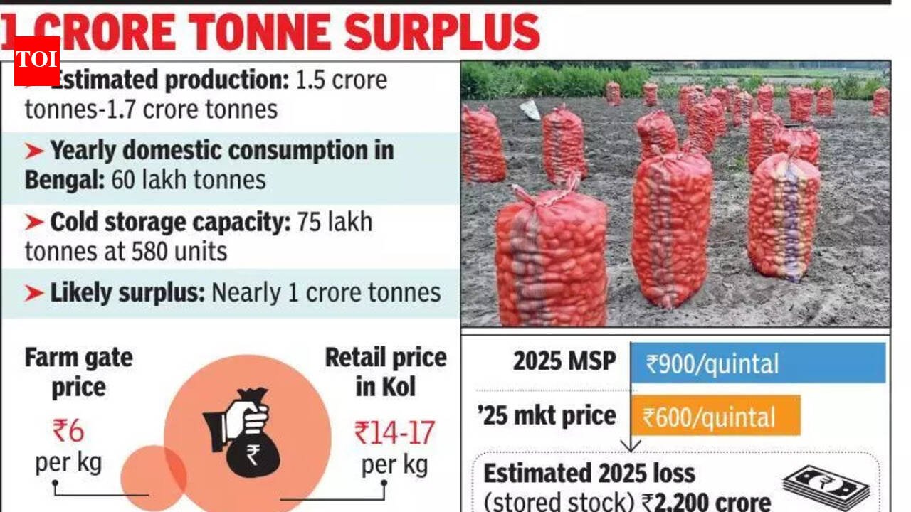 Conservative estimates peg total potato production at around 1.5 crore tonnes and traders believe output could cross 1.7 crore tonnes this harvesting season, ending in April. With the state’s domestic consumption hovering around 60 lakh tonnes, nearly 1 crore tonnes of surplus potatoes may not find buyers or storage space. The state’s 580 cold storages can together hold about 75 lakh tonnes .But panchayat and rural development minister Pradip Mazumdar said, “There is no dearth of demand in the domestic market. If farmers, with the help of technology and science, can produce potatoes with low moisture content, there can be export potential.”In 2024, when production had dipped, retail price in Kolkata had risen to Rs 45 per kg. “If the govt did not intervene, people would have been forced to buy potatoes for Rs 55 a kg,” pointed out agri-marketing minister Becharam Manna, adding the see-sawing of prices was a continuous process and a lot of it was controlled by middlemen.Potato remains one of the biggest cash crops in Bengal, cultivated on 5 lakh hectares. While the bumper harvest reflected agricultural success, the lack of market alignment threatened to turn the abundance into crisis, said insiders. “This time, the yields are exceeding 30 tonnes per hectare,” said Sunil Kumar Rana, president of West Bengal Cold Storage Association. “But higher production without market support may lead to a sharper price fall than that last year.” The industry is still reeling from last season. In 2025, the state offered a minimum support price (MSP) of Rs 900 per quintal under a procurement scheme. But open market prices fell to around Rs 600 per quintal, resulting in losses of Rs 2,200 crore on 72 lakh tonnes of stored potatoes. “If production is even higher this year, a deeper crash is feared,” said Subhajit Saha, WBCSA vice-president. Cold storage operators, already facing rising power tariffs, labour costs, maintenance expenses and compliance requirements, warn that without urgent policy intervention, farmers and storage owners would face severe financial strain. At its 61st AGM in Kolkata, WBCSA urged the state to take immediate steps to prevent distress sales and wastage. Saha said. “Without buyer-seller meets and smoother inter-state marketing, there’s a risk of large quantities rotting in the fields.” “Unless steps are taken to stabilise prices and expand market access, Bengal’s record potato output could turn into a burden,” said Patit Paban De, former president, WBCSA.