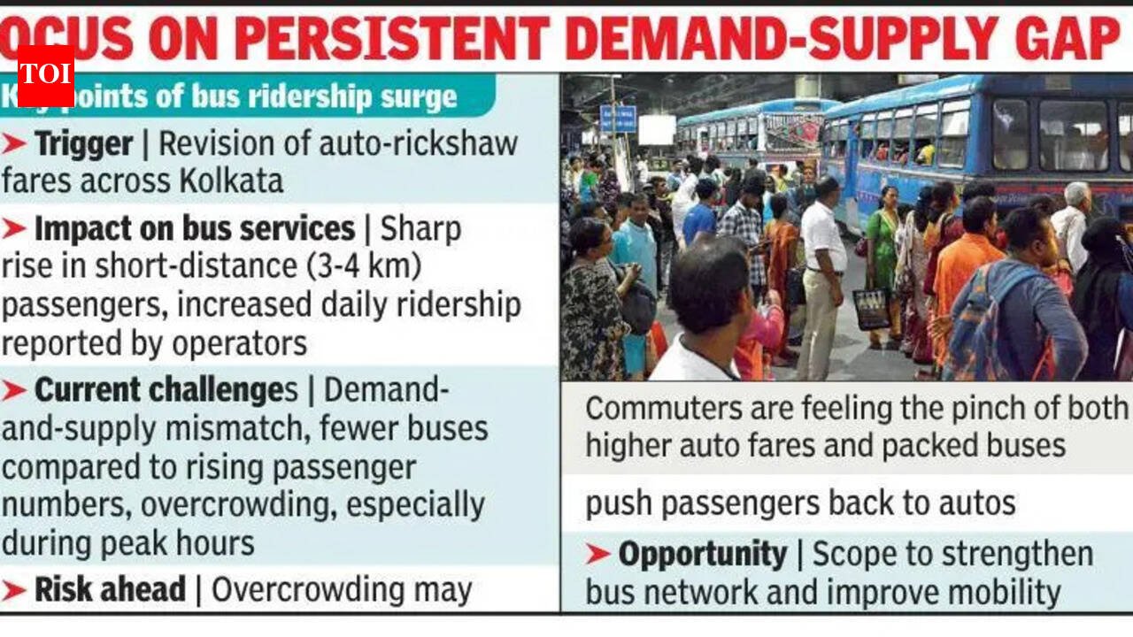 Kolkata: Kolkata’s bus services are witnessing a noticeable revival following the recent revision in auto-rickshaw fares, with operators reporting an increase in short-distance commuters. However, the resurgence has exposed a persistent demand-supply gap, resulting in overcrowded buses and concerns over whether the gains can be sustained.Transport operators said the fare hike of Rs 2-5 on auto routes across the city has nudged many passengers — especially those travelling short distances of 3-4 km — back to buses, which remain one of the most affordable modes of public transport. But the surge is happening at a time when buses are at their lowest number, due to ECI requisition for the polls ahead.“Over the past few days, we’ve seen a clear jump in passenger count, particularly on short routes. People who earlier preferred autos for convenience are now opting for buses because of the cost difference,” said Titu Saha, secretary, City Suburban Bus Service. Auto-rickshaw operators, meanwhile, acknowledged a dip in ridership after the fare revision but defended the hike as necessary. “Fuel prices and maintenance costs have gone up. We had no option but to revise fares,” said Abdul Rahman, an auto driver operating on the Esplanade-Lohapool stretch. “Yes, some passengers have shifted to buses, but many will return if bus services remain overcrowded and unreliable,” he added.Commuters, however, are feeling the pinch of both higher auto fares and packed buses. “I used to take an auto for short distances, but now it’s too expensive. So I’ve switched to buses, but they are so crowded that it’s difficult to board during peak hours,” said Sayani Sikdar, a college student. Another commuter, Sandeep Dhara, an insurance employee, said, “Buses are cheaper, no doubt, but the frequency is an issue. When a bus finally arrives, it’s already full,” he said.Operators admit that the system is struggling to cope with the sudden rise in demand. “There is definitely a mismatch right now,” said Tapan Banerjee, secretary of a bus operators’ syndicate. “Passenger numbers have increased, but the number of buses on the road hasn’t gone up proportionately. This is leading to overcrowding, especially during peak hours.” “We are concerned that if this trend continues, people might shift back to autos,” Saha added. “No one wants to travel hanging from the footboard or squeezed inside a packed bus.” A sustained shift towards buses could reduce congestion and emissions, but only if service frequency and fleet size are increased to meet demand, said the former KMC director general (Town Planning), Dipankar Sinha.“If authorities can improve availability and reliability, buses can regain a significant share of urban mobility. Otherwise, this shift may only be temporary,” said transport researcher, Anindyo Guha.
