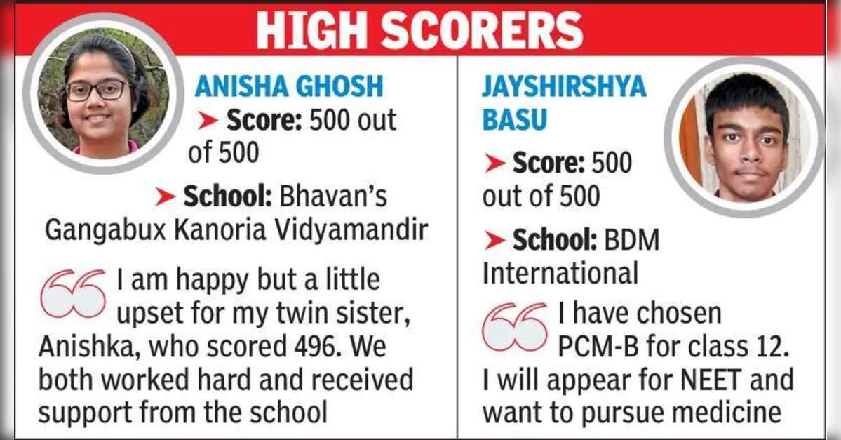 According to the latest updates from city schools, Anisha Ghosh from Bhavan’s Gangabux Kanoria Vidyamandir and Jayshirshya Basu from BDM International School secured a perfect score of 500 out of 500.