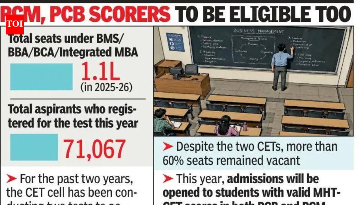 Mumbai: Two years after introducing a CET-based entry process for courses such as BMS, BBA, BCA and integrated MBA, the state govt has decided to modify the norms to address the issue of vacant seats and delays in the process. Students with a valid MHT-CET score in either PCM or PCB will also be eligible to apply from now on. The first preference, though, will be given to candidates who have appeared for the dedicated CET conducted for these courses (with a non-zero score). The remaining seats will be opened to students with PCM and PCB scores only after this pool of candidates is exhausted. MHT-CET scores are currently used only for admissions to engineering, pharmacy and agriculture courses in the state. A govt resolution is likely to be issued in a day or two.After these programmes were brought under the purview of the All India Council for Technical Education (AICTE) and classified as ‘professional’ courses, an entrance test was introduced for the first time in 2024-25, as per state regulations for professional programmes. Earlier, admissions were based only on Class 12 scores. Additionally, the state conducted the entrance test twice to accommodate students who missed the first attempt. This, however, pushed the process into Oct, by which time most colleges completed their first semester. Fewer students, therefore, were willing to wait, and the delays also disrupted the academic calendar of colleges. Subsequently, for the past two admission cycles, institutions had witnessed a significant number of vacant seats. For the 2026-27 admission cycle, too, about 70,000 candidates have registered for the entrance test for over one lakh seats available in all the courses put together. A govt official said the primary issue is to address the delay. “The two CETs conducted by the govt have been delaying the entire process. It has, therefore, been decided to allow admissions through MHT-CET scores too. However, these will be allowed only after the pool of candidates with a valid score in MAH-BBA/BMS/BCA CET is exhausted. In case of a tie, students with PCM scores will be preferred,” said the official. Another official said the decision will also give MHT-CET aspirants another option if they do not land a seat in engineering or pharmacy.Faced with complications related to AICTE-recognised courses, which were earlier regulated by Mumbai University, many city colleges had changed the nomenclature of their once-popular BMS course to BCom (Management Studies). After going through a delay in admissions, some colleges, which earlier went with the AICTE, decided to split their divisions into two: one under the university, with the changed nomenclature as BCom (Management Studies), and the other under AICTE as BMS, to ensure they do not lose out on high-scoring students.