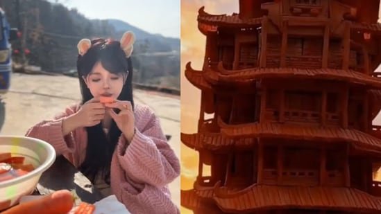 In several videos, Qin shows the entire process, slowly biting into the carrot bit by bit.