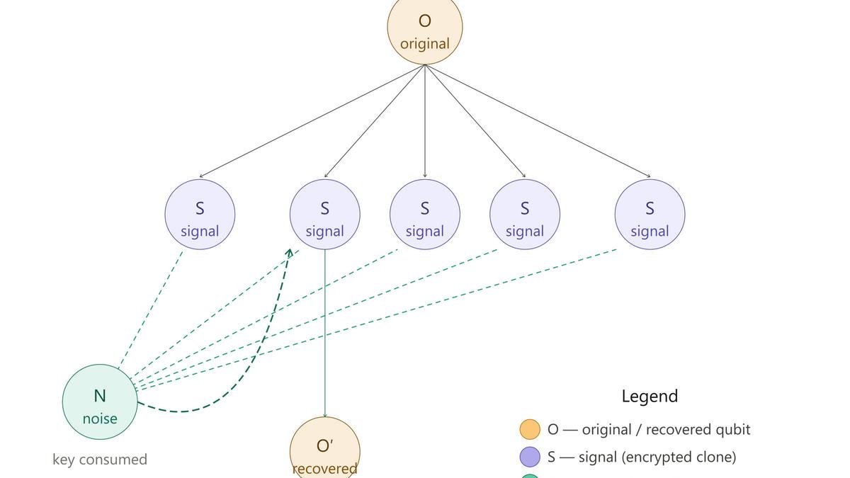 When you want to recover the original state, you apply the decryption operation to any one of the encrypted clones using the full set of noise qubits. This restores the original perfectly. But the decryption process consumes the key. So after you decrypt one clone, the key is gone and every remaining clone becomes permanently scrambled. Which means you only get one perfect recovery. (The no-cloning theorem says you cannot freely access multiple identical copies.)