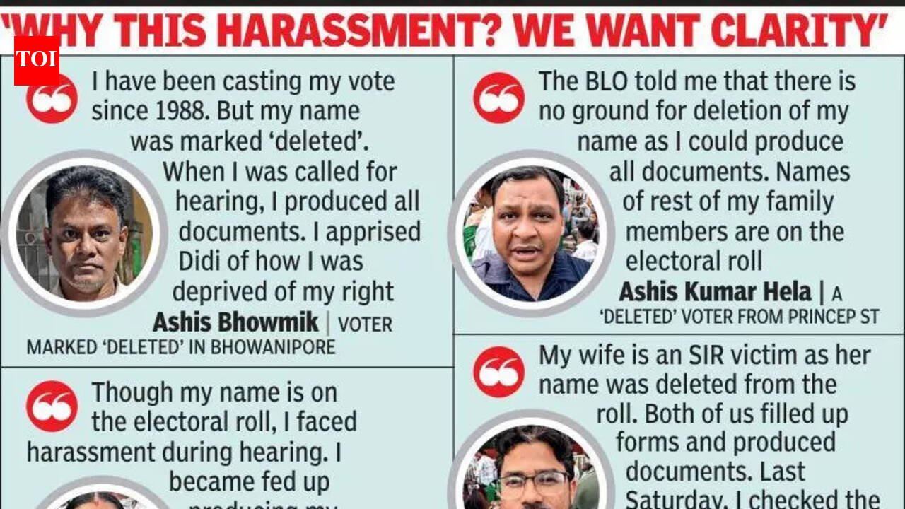 Kolkata: Several “SIR-harassed” families who have been living in the city and suburbs for long but were deprived of their voting rights thronged chief minister Mamata Banerjee‘s dharna manch on Saturday, the second day of her sit-in protest at Esplanade against the “wrongful deletion” of genuine voters from the electoral roll.The CM called over 43 “ghosts” — “dead” and “deleted” voters and their family members — on to her dais and observed a 1-minute silence at the venue in protest against the injustice meted out to these voters, who displayed their enumeration forms and documents such as Aadhaar cards. The CM stated, “These people have documents but their names have vanished. During the SIR they showed their documents but that was of no use. So, they have come to show you (the audience) the documents. They are here to demand justice. Our movement is for them.”Ashis Bhowmik (56) was among the “dead” voters from Bhowanipore assembly constituency whom the CM called on to the stage. He said, “I have lived in the Alipore area since my birth and cast my vote since 1988. But my name was deleted from the electoral roll. When I was called for the SIR hearing at New Alipore Multipurpose School, I produced all my documents required for the exercise. Despite this, why was the EC under the impression that I am a dead voter? Ever since the electoral roll was brought out, I was on tenterhooks about the deletion of my name from the roll. Today, I apprised Didi of how I was deprived of my voting right. And, when she said, I displayed my documents from the stage.”“Deleted” voters and many others who were placed under the lens of judicial scrutiny from other parts of the city also sat near the CM’s stage and expressed concerns over their future.Ashis Kumar Hela, a deleted voter from Princep Street, said, “The BLO told me that there is no ground for deletion of my name from the electoral roll since I could produce all documents, including my Madhyamik certificate. The rest of my family members, like my parents and my wife, are on the electoral roll, while my name has vanished. May I seek clarity from the EC on why it happened.”Chaitali Chakraborty, who came all the way from Dakshineswar to join the sit-in protest on Saturday, said, “Though my name is on the electoral roll, I faced harassment during the hearing. I became fed up producing my documents one after another. There was no valid ground for calling me to the hearing since I could furnish the EC-specified documents during enumeration. Why are the people of Bengal being harassed in the name of SIR?”