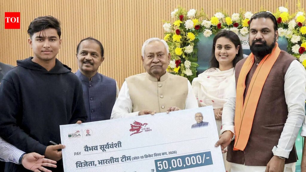Patna: CM Nitish Kumar on Sunday honoured teenage batting sensation Vaibhav Sooryavanshi for bringing laurels to Bihar with his outstanding performance in India’s victorious campaign at the ICC Under-19 Cricket World Cup 2026. He presented the cricketer with a cheque for Rs 50 lakh and an ‘angavastra’ at a programme held at Sankalp Sabhagar at his official residence, 1, Anne Marg.Congratulating Sooryavanshi, the CM said the young cricketer had played a crucial role in India’s triumph. He described him as a new hope for Indian cricket owing to his hard work and talent. “My best wishes are that Sooryavanshi creates new milestones for the Indian team in the future and brings glory to the country,” the CM said in a statement issued by his office.