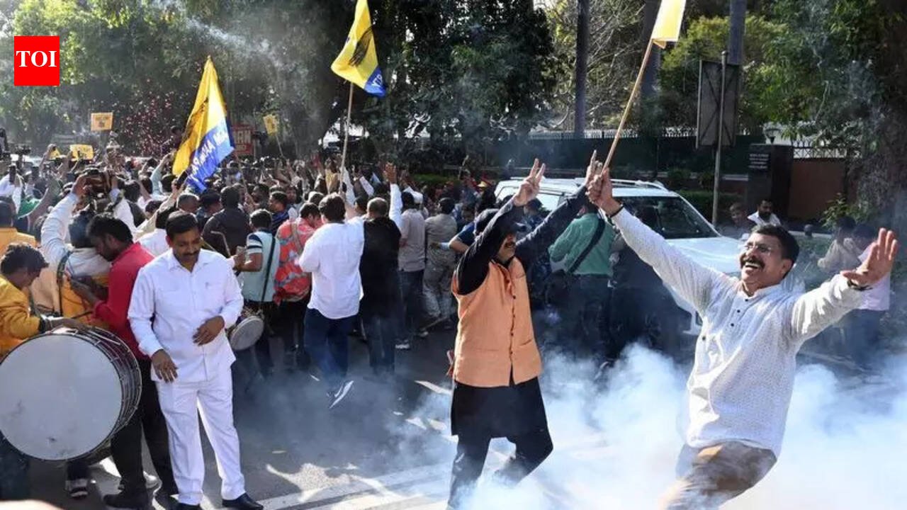 New Delhi: With a court discharging AAP’s Arvind Kejriwal and Manish Sisodia in the excise policy case, celebrations returned to the party headquarters on Friday, nearly a year after the dismal Feb 2025 assembly elections. AAP functionaries and workers gathered outside national convener Kejriwal’s residence on Feroze Shah Road and at the party headquarters at neighbouring Pandit Ravi Shankar Shukla Lane, many carrying colours and flowers. Groups of workers danced to dhol beats and applied colours on one another as security personnel managed the crowd.Kejriwal’s journey from home to the party headquarters, though short, became a victory roadshow. High in intensity, the procession reflected the charged mood among workers. Showered with flower petals, the former chief minister emerged through the sunroof of his car, greeting supporters lining the route to the party office. The atmosphere reverberating with the beats of dhols and chants of “Satyamev Jayate”, Kejriwal acknowledged the crowd with folded hands, thanking them for their support.Supporters displayed a mix of relief and triumph, dancing and waving party flags, as the convoy moved forward. As it reached the headquarters, celebrations intensified, turning the place into the centre stage of festivities. Received by senior functionaries, Kejriwal first went inside the party office. He soon addressed a press conference, speaking at length about the case and declaring that “Kejriwal was not corrupt”. He was flanked by senior functionaries, including former deputy chief minister Sisodia and Rajya Sabha member Sanjay Singh.“The discharge of our leaders in the case proved that the case was fake and hatched under a conspiracy to crush AAP. In the difficult time, we, with party workers, remained united and fought on, and today, in the end, we emerged victorious. Today, we are celebrating the victory of truth over a fake case and democracy over dictatorship,” said an AAP functionary.The party is planning to hold a protest at Jantar Mantar on Sunday against BJP. “The party wants to take this matter to every person in Delhi. Plans are being made to reach out widely so that people are aware of the truth,” another functionary said.