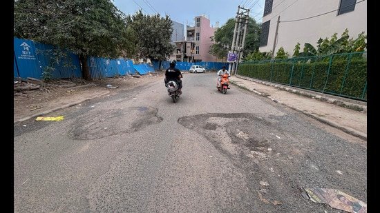 The cratered main road in Sector 5 near HUDA Park as seen on Tuesday. (Parveen Kumar/HT)