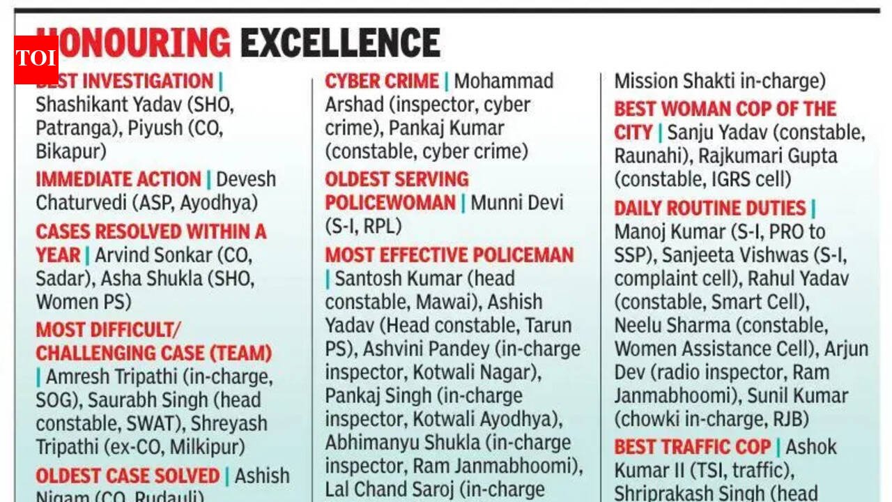 Ayodhya: Lauding the exemplary performance of policemen deployed in the temple town of Ayodhya, additional director general of Lucknow zone, Praveen Kumar, said that it is a matter of pride for policemen that while discharging duties they get the opportunity to heal the wounds of an individual suffering from personal or emotional trauma. The accomplishments of Ayodhya police were celebrated during the Police Pride Awards, an event jointly organised by The Times of India and Navbharat Times at Ramayana Hotel in Ayodhya on Friday.A panel of senior officials deputed in Ayodhya was asked to shortlist men in uniform who have set an example through their actions while facing tough situations during their postings. Ever since Ram temple was inaugurated on Jan 22, 2024, crores of devotees have been visiting Ayodhya and the rush has posed a challenges for the men in uniform. Though additional deployment of police force was done to deal with the pressure, regular visits of dignitaries and VVIPs often resulted in complex situations, as cops had to face the wrath of residents on such occasions.“It is time to acknowledge the efforts of the unknown faces who stand on the ground in uniform, braving the extreme weather of the Awadh region alongside tough situations that emerge while dealing with the public directly,” ADG Praveen Kumar said.Overwhelmed with emotions while offering gratitude to dedicated police personnel, the 2001 batch IPS officer said, “As officers, we all need to be proud about the fact that we are the most visible agents deputed to defend the Constitution. Private companies and industrial groups, through their corporate social responsibility initiatives, are doing something good for society. But policemen are among a very few who get a chance to help a person in distress while getting paid.“One such awardee among the 36 who were selected under 17 different categories, Ashvini Pandey, station house officer of Nagar Kotwali, was adjudged the most effective policeman.“Having been deputed for a long period, Pandey has been discharging his day-to-day duties with complete sincerity. Local traders, businessmen, seers, saints as well as common residents have honoured him on different occasions and have been offering only positive feedback. That is how he was shortlisted among the most effective men in khaki,” an officer said.Senior officials said that many more personnel who work in the background without seeking credit could not be felicitated but, through such events, their efforts were also being celebrated.“We need to keep working positively and release positive vibes in society,” said special guest on the occasion, Bharat Das Maharaj, chief of Udasin Ashram in Ayodhya.
