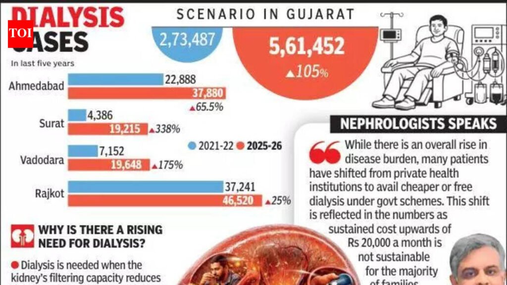 Ahmedabad: In 2021-22, Gujarat was still under the shadow of the pandemic, but those who had chronic kidney disease (CKD) or renal failure and needed to undergo dialysis to stay alive had to visit centres under the state govt-run dialysis network. During this period, the Institute of Kidney Diseases and Research Centre (IKDRC), the nodal agency for govt-run centres, recorded 2.73 lakh dialysis procedures at the rate of about 750 a day.This financial year — even when procedures from March are yet to be counted — the number has already touched 5.61 lakh, about 1,680 procedures a day, showing that numbers have more than doubled in just five years. The statistics is troubling because the only way patients can be off the dialysis, a procedure often required twice or thrice a week, is kidney transplant either from cadaver or living donors.IKDRC director Dr Pranjal Modi said that Gujarat currently has network of 280 dialysis centres that provide treatment under govt schemes. Over the years, the network has expanded to the taluka level so that patients don’t have to travel long distances, he added.Nephrologists at IKDRC said that the current financial year has seen 64,109 patients availing dialysis services so far. “Apart from the rise in absolute number of patients due to factors such as rise in non-communicable diseases (NCDs) like diabetes and hypertension, the rise can also be seen in the light of the fact that it is an expensive procedure, and over the years the families switch to the public hospital services from private hospitals,” said Dr Himanshu Patel, senior nephrologist at IKDRC.Trend of the four major districts – Ahmedabad, Surat, Vadodara, and Rajkot – and the rest of the state indicated that compared to 72% rise in the four, the rise in dialysis procedures is sharper in rest of the state at 117%. Several smaller centres have more than 1,000 patients availing services. Experts believe that the overall number of procedures and patients would be higher if services availed at private facilities are factored in.Dr Mayank Shah, a nephrologist with Shalby Hospitals, said that about one in every 10 kidney patients they see have CKD that needs long-term intervention. “We tell the patients — and physicians — that majority of the patients we see directly come in the advanced Stages 4 or 5. Thus, if a patient shows long-term illness in terms of diabetes and hypertension, they should also be checked for renal health,” he said.