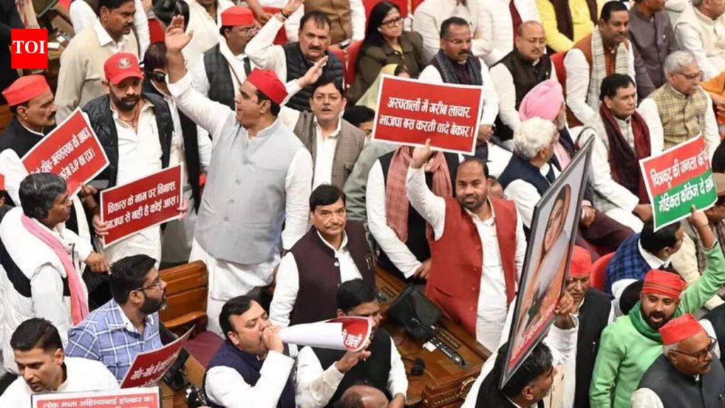They shouted slogans like ‘Governor madam go back, go back’ and ‘Governor’s address is a bundle of lies’. Interestingly, SP member Engineer Sachin Yadav wore a T-shirt over a ‘kurta’ with Manikarnika Ghat demolition photograph printed on one side and picture of Malwa queen Ahilyabai Holkar on the other side. Sardhana MLA Atul Pradhan carried a big poster of Holkar. Other members like Zahid Beg, Dr Ragini Sonker, Faheem, Pankaj Malik and others held placards and indulged in sloganeering. When the House met at 11am and Speaker Satish Mahana invited the governor to read out the address, senior SP member Sangram Yadav raised the SIR issue.Terming the governor’s address as a “bundle of lies”, SP members shouted slogans including “False speech will not be accepted”.Sloganeering by SP members continued till the conclusion of the address.Amid slogans such as ‘Killer of Dalits and backwards’ and ‘Anti-reservation govt will not be accepted’, the governor completed her address, which lasted over 30 minutes.Even though the speech was hardly audible amidst the chaos, the governor in her written address listed the achievements of the govt under Chief Minister Yogi Adityanath.Ahead of the start of the session, SP MLAs held protests on the Assembly premises against the alleged anti-people policies of the govt.SP national spokesperson and legislative council member Rajendra Chaudhary alleged that the govt had failed on all fronts. They also raised discrepancies in SIR of electoral rolls.