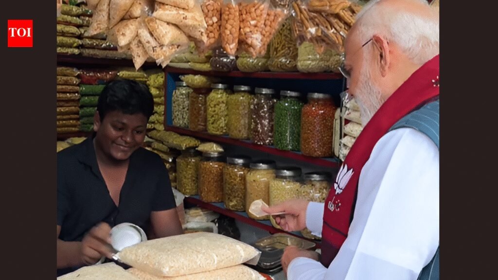 NEW DELHI: Prime Minister Narendra Modi on Sunday took a candid jhalmuri break amid the hustle, bustle and political heat of West Bengal, where the BJP, led by him, is mounting a strong challenge to Mamata Banerjee’s 15-year incumbency.After concluding his address in Jhargram, PM Modi walked up to a jhalmuri stall and said, “Bhai, hume apna jhalmuri khilao.”As the vendor prepared the snack, the Prime Minister engaged him in a brief chat, asking, “Kitne ka hota hai jhalmuri?”He then reached into the pocket of his Nehru jacket to pay. Meanwhile, the vendor asked, “Aap pyaaz khaate hain?”, PM replied, “Haan, pyaaz khaate hain. Dimag nhi khaate bass.”PM Modi held multiple rallies across Bengal on Sunday, addressing gatherings in Bankura, Purulia, Jhargram and Medinipur, further intensifying the already heated contest between the TMC and the BJP.